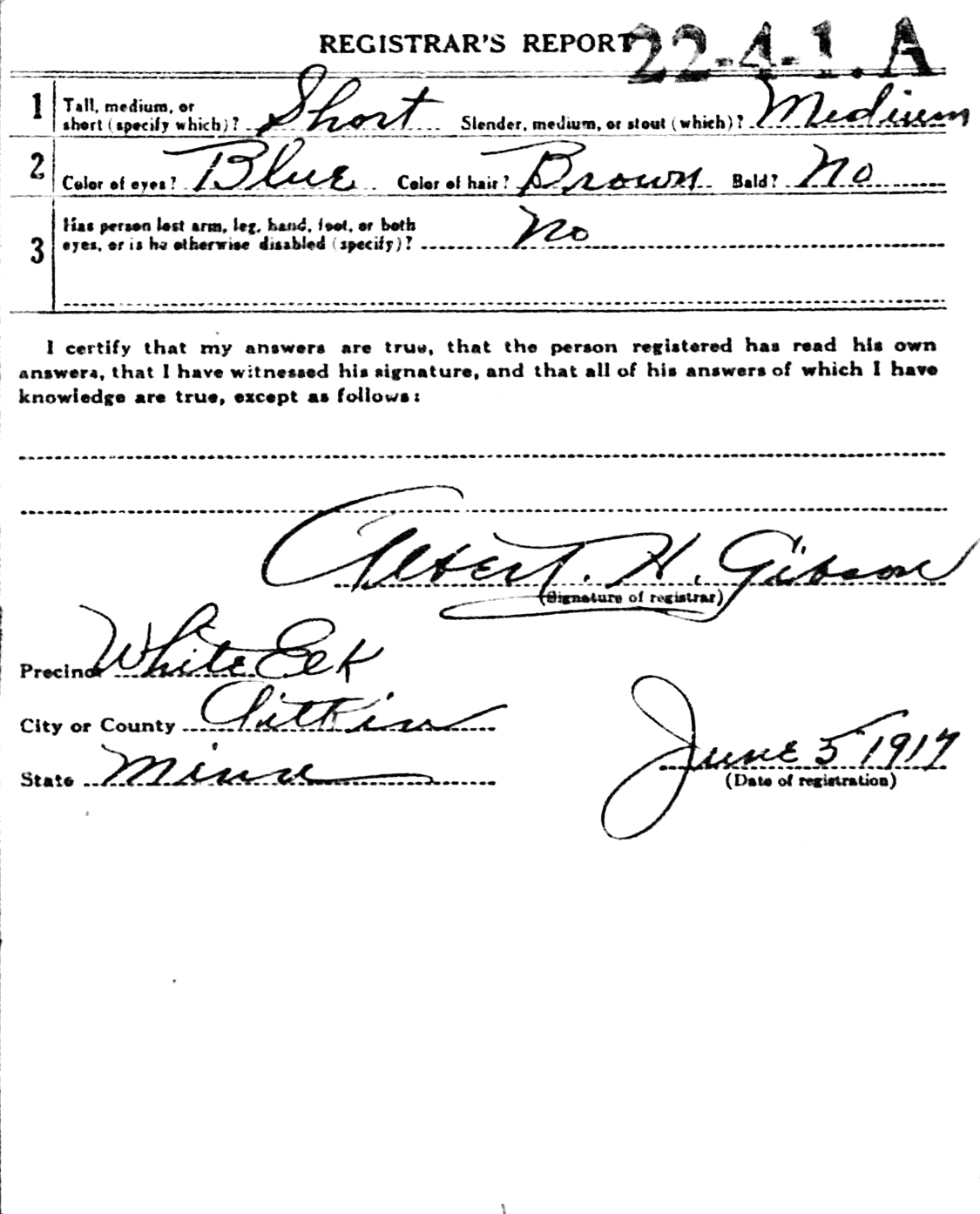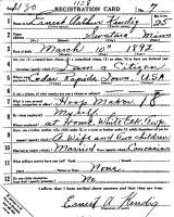 The WWI Draft Registration Report dated June 5, 1917, shows Ernest Arthur Kendig, born March 10, 1892, in Cedar Rapids, Linn Co., IA, is a married Hoop Maker, and is living in Swatara, White Elk Twp., Aitkin Co., MN.