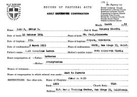 Arthur Daniel "Art" Larson was confirmed March 2, 1953, at the United States Naval Training Center, San Diego, San Diego Co., CA.
