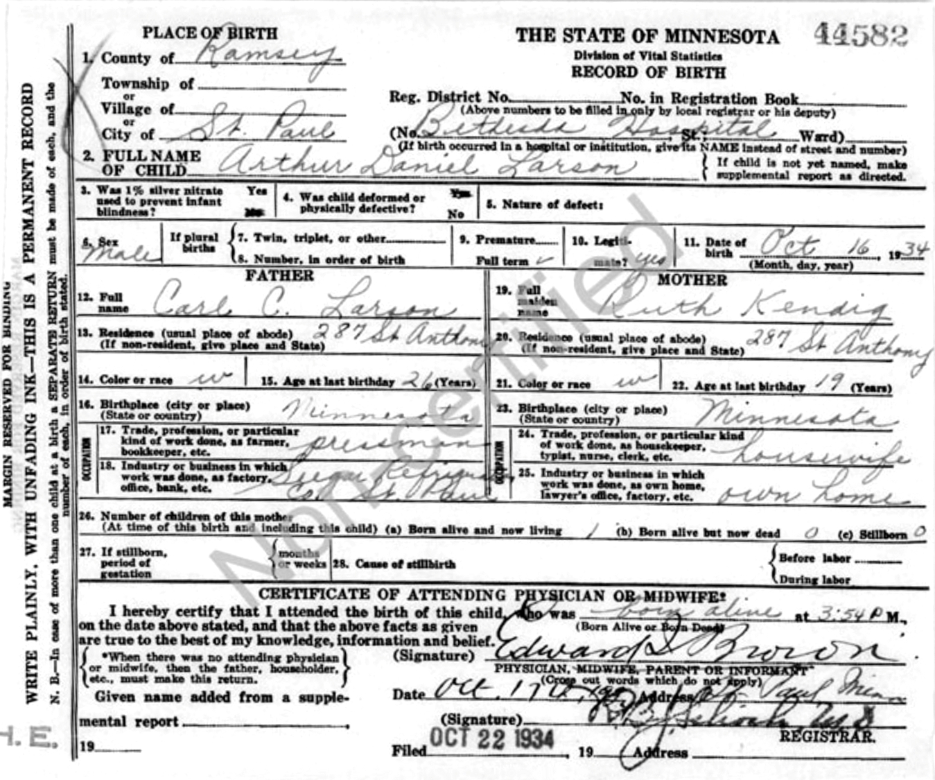 Arthur Daniel "Art" Larson was born October 16, 1934, at Bethesda Hospital, Saint Paul, Ramsey Co., MN.