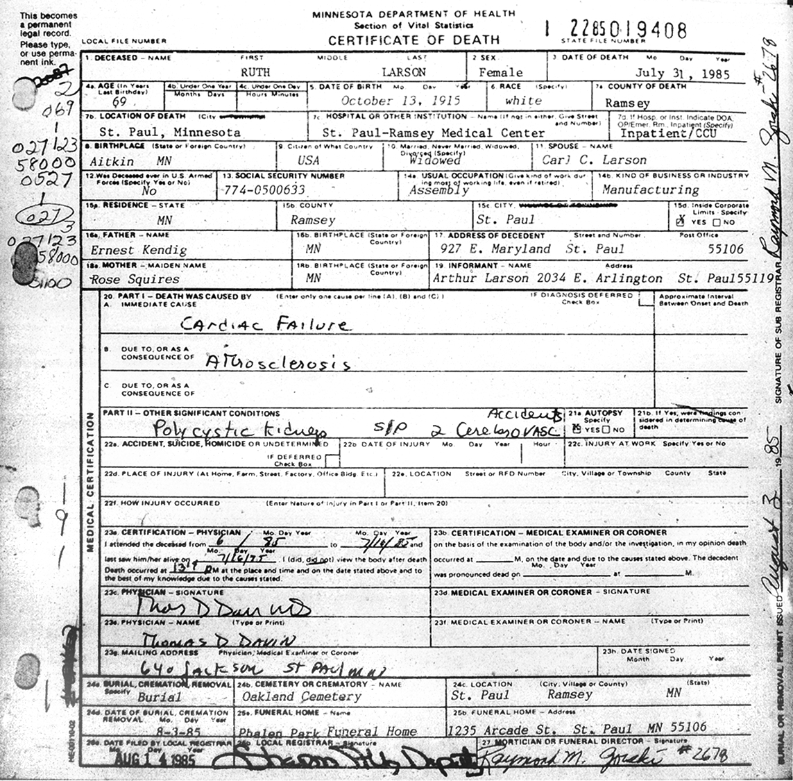 Ruth Elizabeth (Kendig) Larson died July 31, 1985, at Saint Paul - Ramsey Medical Center, Saint Paul, Ramsey Co., MN, at age 69. Buried in Oakland Cemetery, Saint Paul, Ramsey Co., MN.