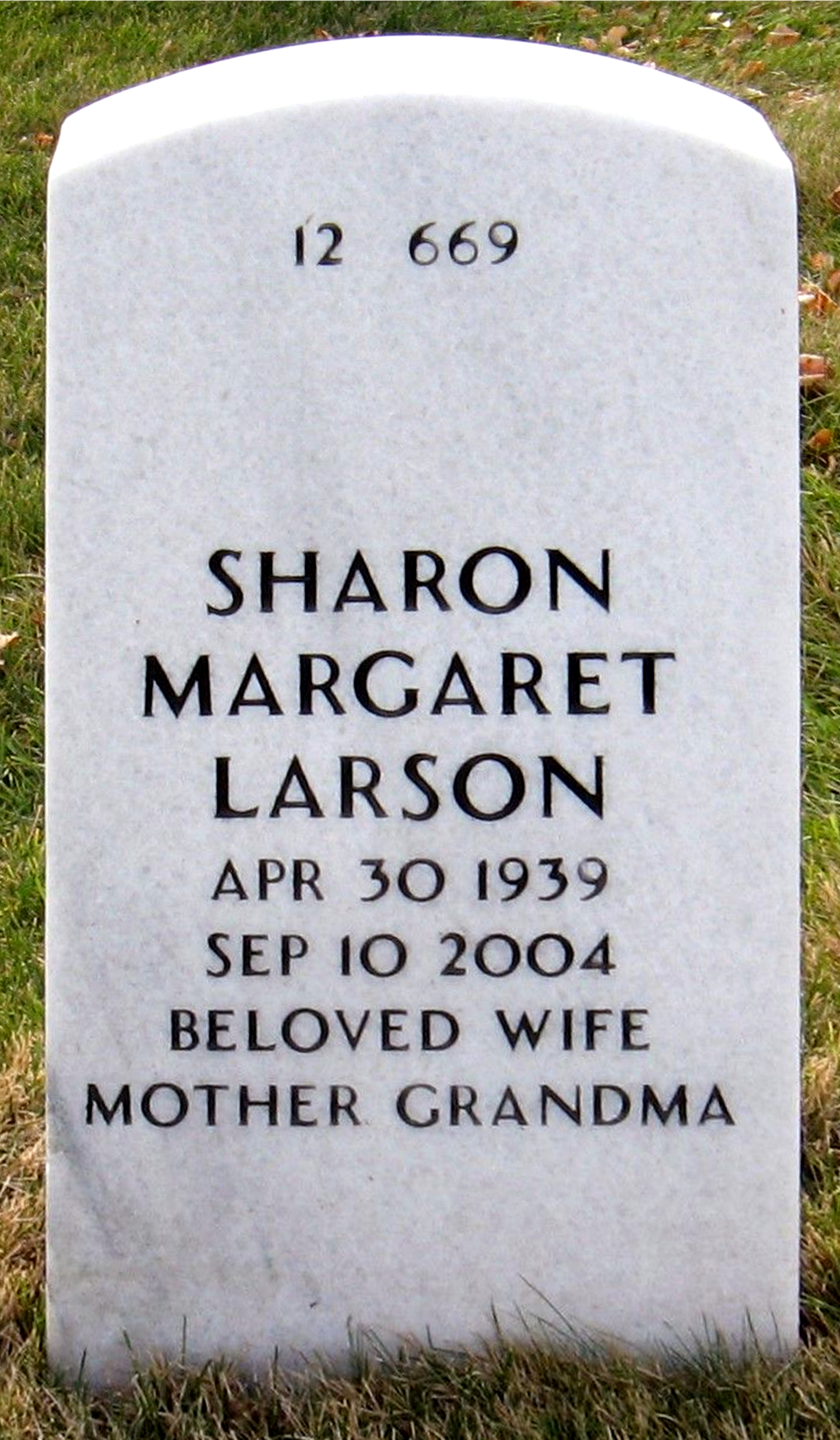 Sharon Margaret (Hunt) Larson died September 10, 2004, in Saint Paul, Ramsey Co., MN, at age 65. Buried in Fort Snelling National Cemetery, Minneapolis, Hennepin Co., MN.