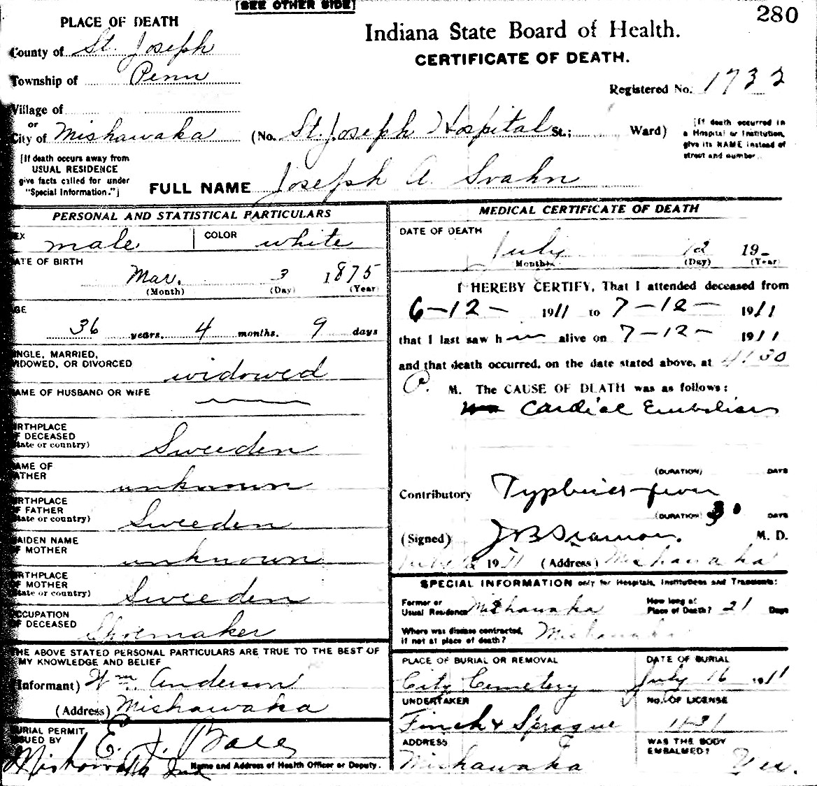 Josef Algot "Joseph" Svahn died July 12, 1911, at St. Joseph Hospital, Mishawaka, St. Joseph Co., IN, at age 38. Buried in Mishawaka City Cemetery, Mishawaka, St. Joseph Co., IN. He died from Typhoid Fever.