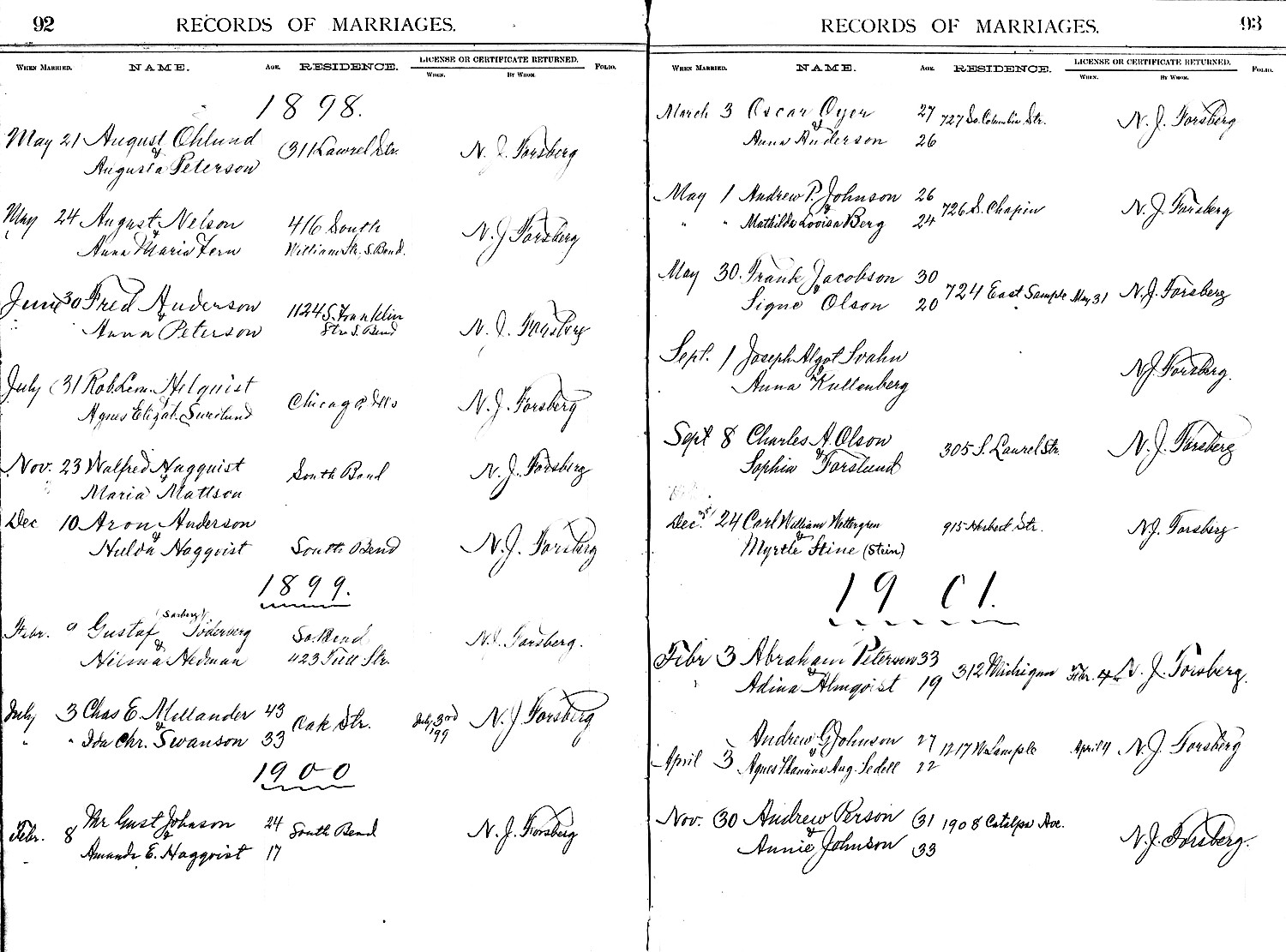 Miss Anna Kullenburg, of this city, and Mr. Algot Swahn, of Mishawaka, were quietly married Saturday evening at 8 o'clock in the home of the bride's cousin, Mr. Wicktor Edstrom, 812 West Jefferson street, Rev. N. Forsberg performing the ceremony in the presence of several relatives. The bride is an attractive young lady and the groom is a young man employed in the rubber department of the Mishawaka Woolen Manufacturing company. Mr. and Mrs. Swahn went Sunday to Joliet and Chicago, and will reside at 812 West Jefferson street, this city.