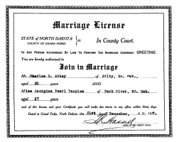 Charles Gilby "Charley" Abbey and Pearl Georgina Peoples were married December 25, 1917, in the Peoples' country home in Gilby Twp., Grand Forks Co., ND.