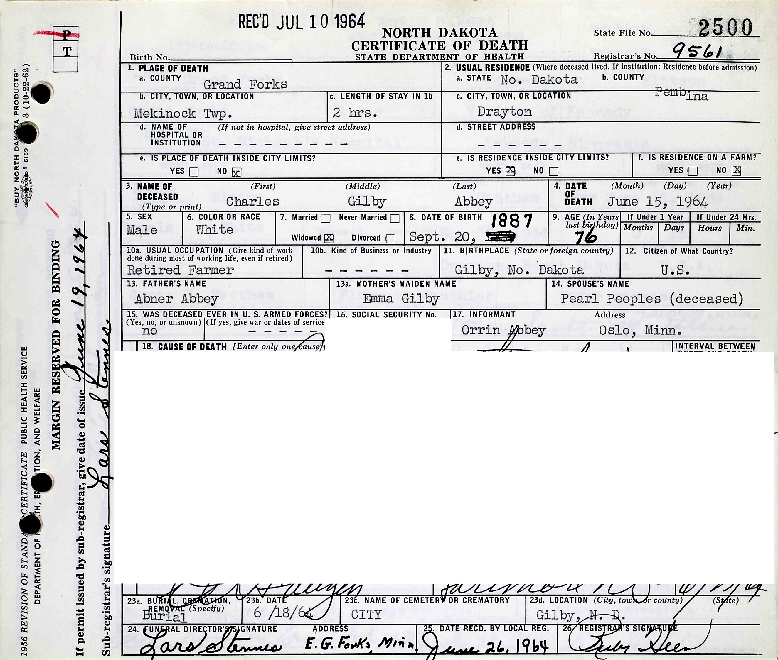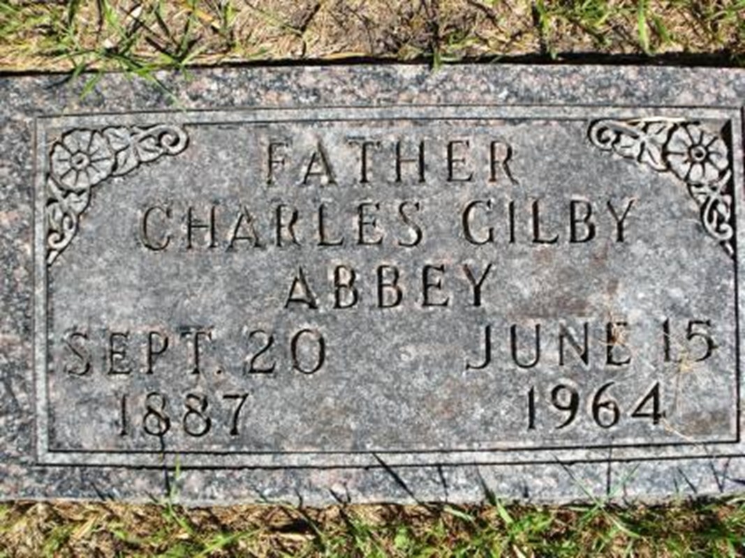Charles Gilby "Charley" Abbey died June 15, 1964, in June 15, 1964, in Drayton, Mekinock Twp., Grand Forks Co., ND, at age 76. Buried in Prairie Home Cemetery, City of Gilby, Gilby Twp., Grand Forks Co., ND.