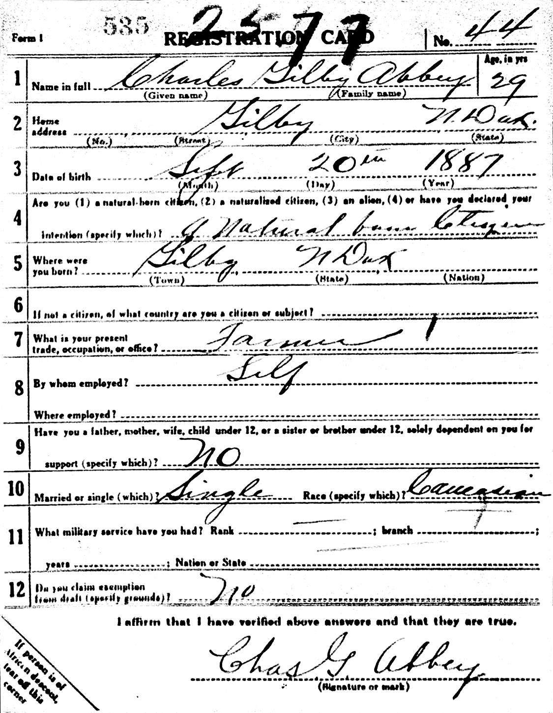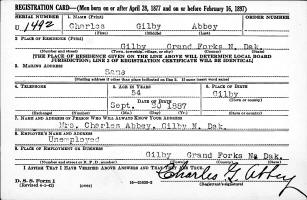 The WWI Draft Registration Report dated June 5, 1917, shows Charles Gilby Abbey is an unmarried Farmer, and is living in Gilby, ND.