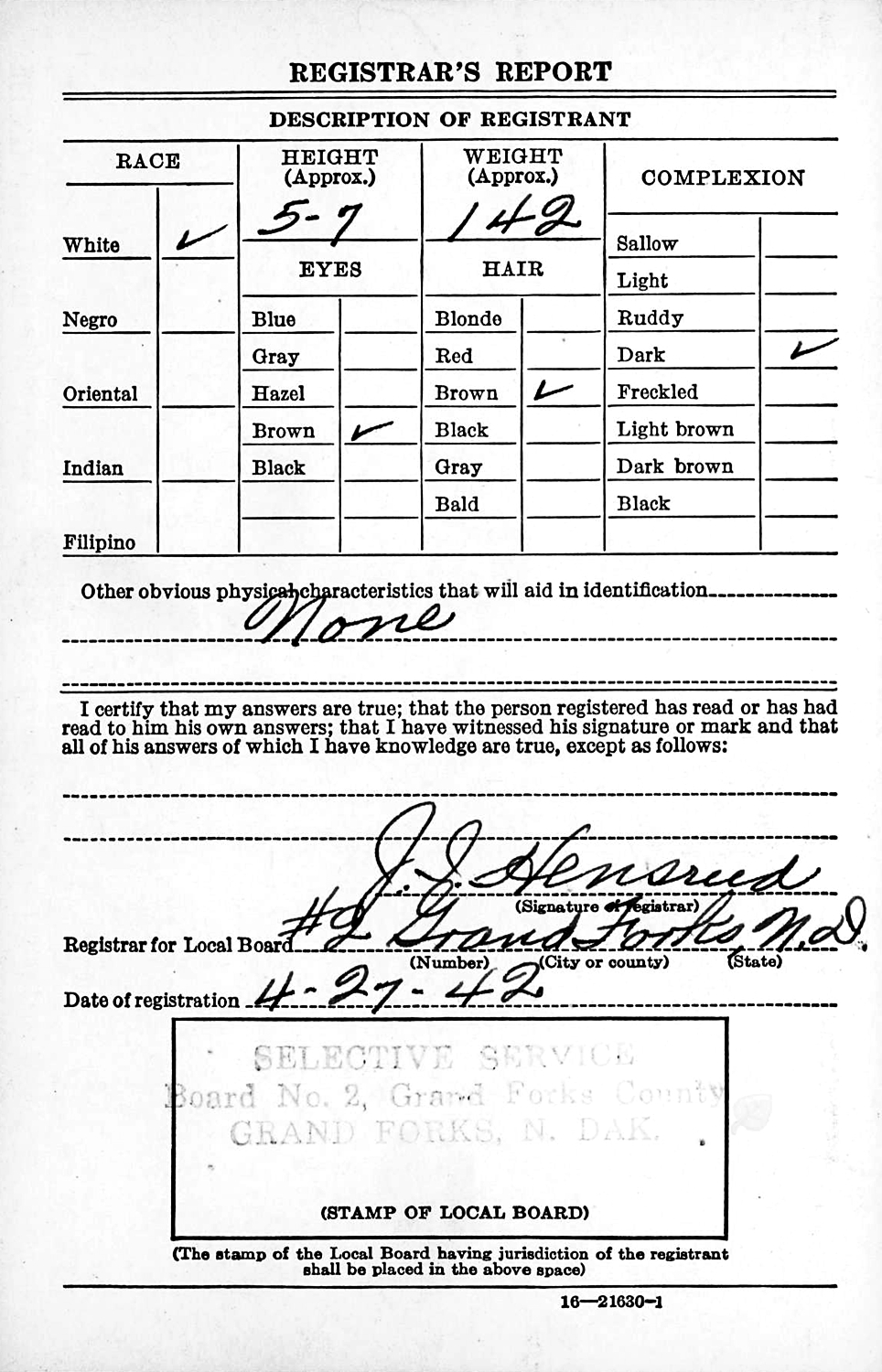 The WWII Draft Registration Report dated April 27, 1942, shows Charles Gilby Abbey is married, unemployed, and is living in Gilby, ND.