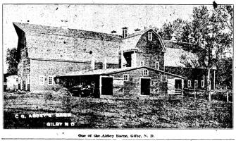 Charles Abbey, the proprietor of the Abbey Dairy Farm, is himself a North Dakota product. His father, Abner Abbey, is one of the most interesting of the remaining pioneers. He came to the territory of Dakota in 1873 from near Port Hope, Ontario. For two years he drove a mule team in the government service, having one of the train of 406 mule teams plying between Fort Ambercrombie, fifteen miles south of Fargo, to Fort Lincoln, near Bismarck. The main line of the Northern Pacific railway was being surveyed. Custer was in command of the cavalry that protected the great supply train of prairie schooners and herds of cattle. Mr. Abbey has a wealth of interesting stories to tell about those wild days. His recollections of General Custer, and of the many skirmishes with the Indians, and the attacks of the buffalo on the cattle, would make a thrilling chapter. The next year Mr. Abbey was in the party that surveyed the Canadian boundary. In 1880 he came to what is now Gilby, and took a homestead near Voss, which he held for several years. Then he filed on a pre-emption four miles southeast of the present townsite of Gilby, and he has lived there ever since, on the farm which his son Charles Abbey now operates. This land was bought from the Gilby brothers, George and James. The Gilby brothers came from Wisconsin in 1879. The first post office was on John Gilby's land, joining the present Abbey farm, and with it the township was named for John Gilby, the first postmaster. In '82, Emma Gilby came out to Dakota to keep house for her brothers. Here she met Abner Abbey, and a romance began, the light of which still shines from their faces as they recount the history of the early days. Mr. nd Mrs. Abbey have left the arduous work of the farm to the younger generation, and are now comfortably situated in town.