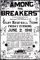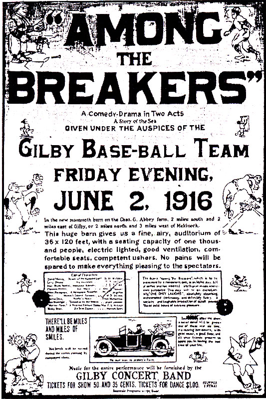 A date was set and posters were displayed far and near. In detail they read, "A Comedy�-Drama in Two Acts will be given under the auspices of the Gilby Baseball Team, Friday Evening, June 2, 1916 in the new mammoth barn on the Chas. G. Abbey farm, 2 miles south and 2 miles east of Gilby, or 2 miles north and 3 miles west of Mekinock. This huge barn gives us a fine airy auditorium of 36 x 120 feet, with a seating capacity of one thousand people, electric lighted, good ventilation, com�fortable seats, competent ushers. No pain will be spared to make everything pleasing to the spectators."