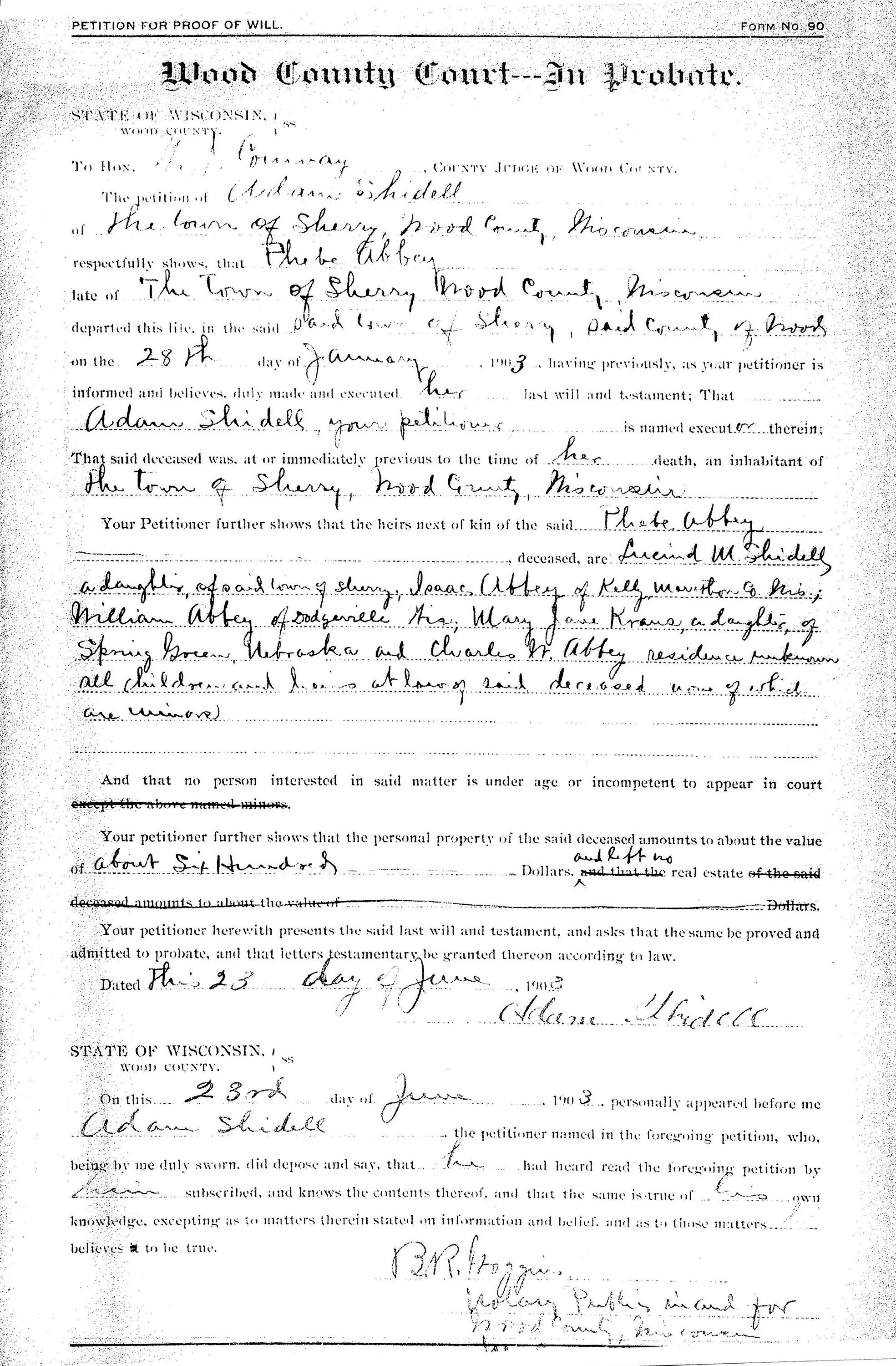 Phoebe Elizabeth "Phebe" (Searle) Abbey Probate Records. Adam Shidell was the Executor of the estate.