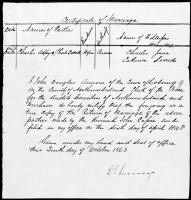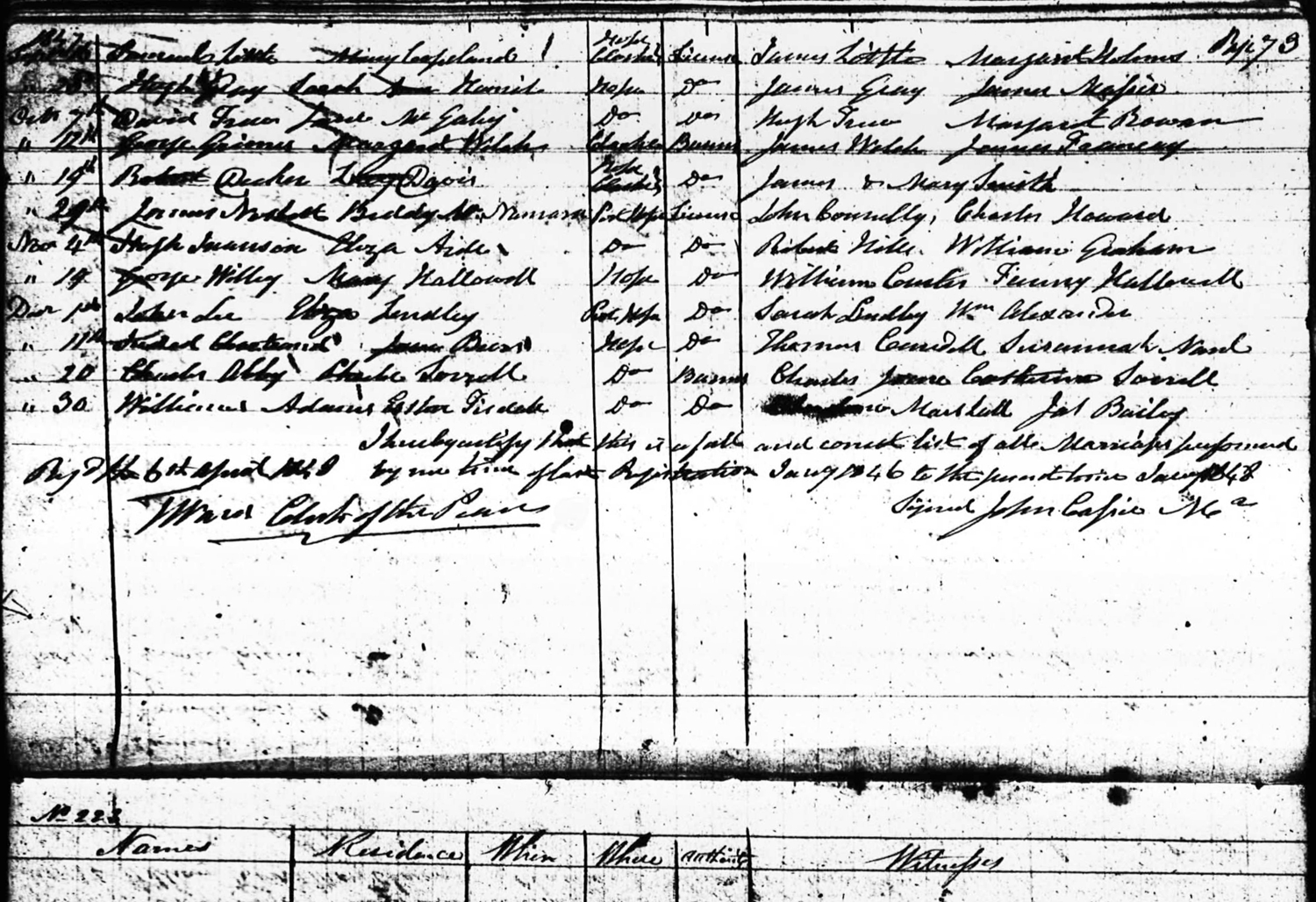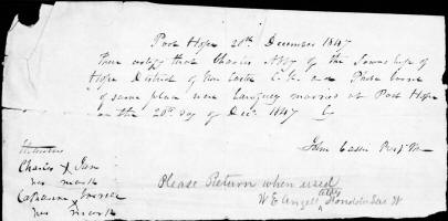 Isaac Phineas Abbey and Lucinda B. "Sandy" Bradley Marriage Record. Married by Banns by Joseph Thompson, St. John's Anglican Church, in the presence of Mary Abbey and Elizabeth Bradley.