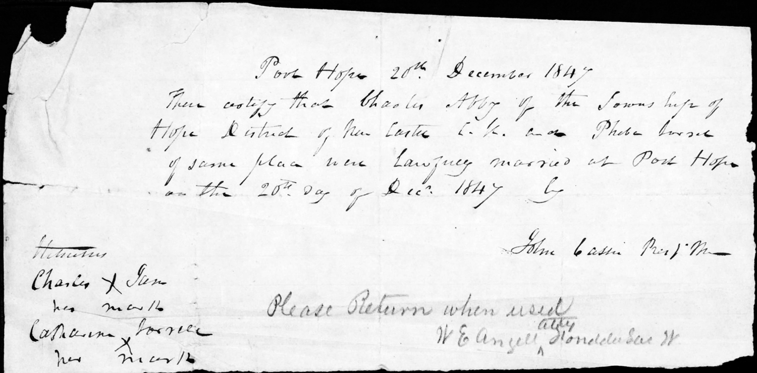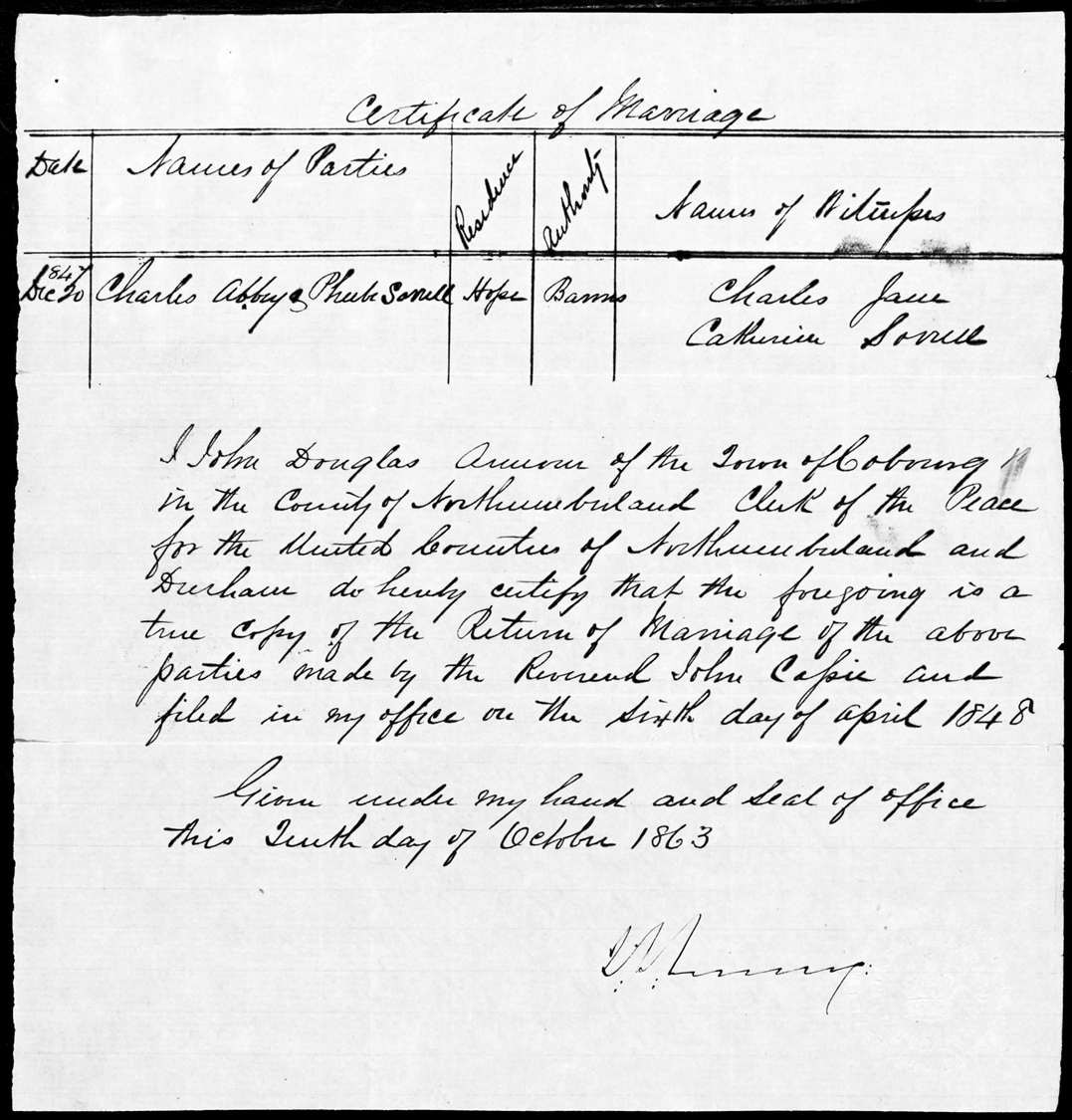 Charles Oliver "Charlie" Abbey (age 22), a bachelor, and Phoebe Elizabeth "Phebe" Searle (age 21), a maiden, were married December 20, 1847, in Port Hope, Durham Co., Canada West. The Family Bible shows: Married December 19, 1847: Mr. Charles W. Abbey and Miss Phebe E. Searles. Charles Jane and Catharine Sorrell, neither of whom could write their name, witnessed the marriage.