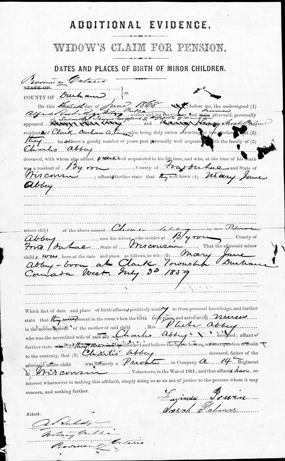 Mary Jane Abbey Birth Record. As a Civil War widow applying for survi vor benefits for her minor children, Phoebe Elizabeth (Searle) Abbey needed to provide birth certificates. Since none existed, she needed to provide affidavits from those who attended the birth.