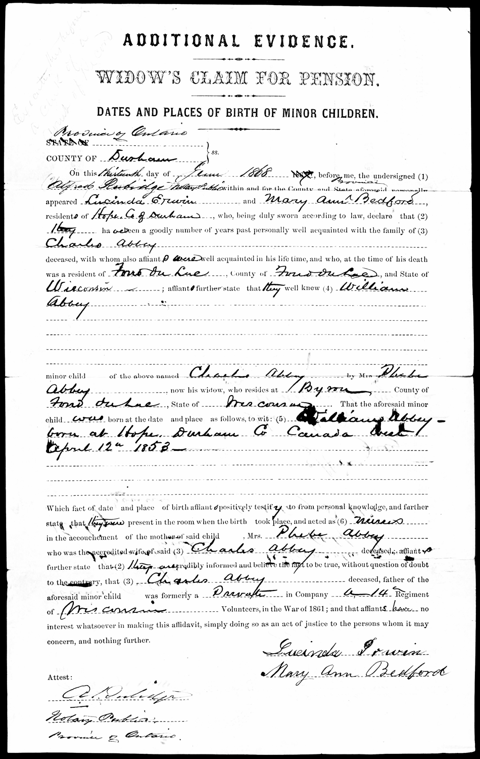 Charles Washington Abbey Birth Record. As a Civil War widow applying for survi vor benefits for her minor children, Phoebe Elizabeth (Searle) Abbey needed to provide birth certificates. Since none existed, she needed to provide affidavits from those who attended the birth.