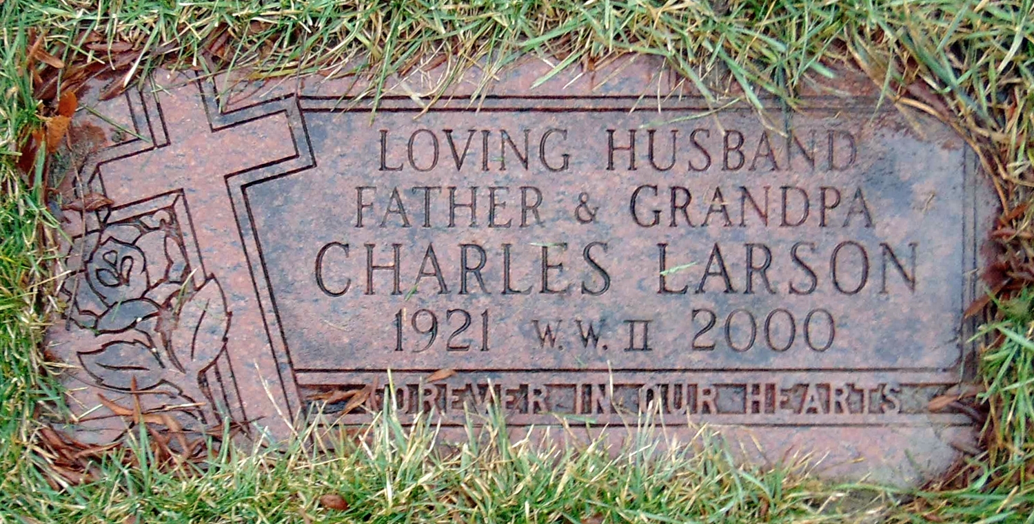 - Charles Oscar "Charlie" Larson Jr.: Born January 6, 1921, in Chicago, Cook Co., IL ; Died about August 1, 2000, in Unknown (age 79). Buried in Holy Sepulchre Cemetery, Alsip, Cook Co., IL. Married May 20, 1948, in Cook Co., IL, to Irene Gladys Over: Born June 6, 1922, in Chicago, Cook Co., IL; Died June 8, 1993, in Chicago, Cook Co., IL (age 71). Buried in Holy Sepulchre Cemetery, Alsip, Cook Co., IL.