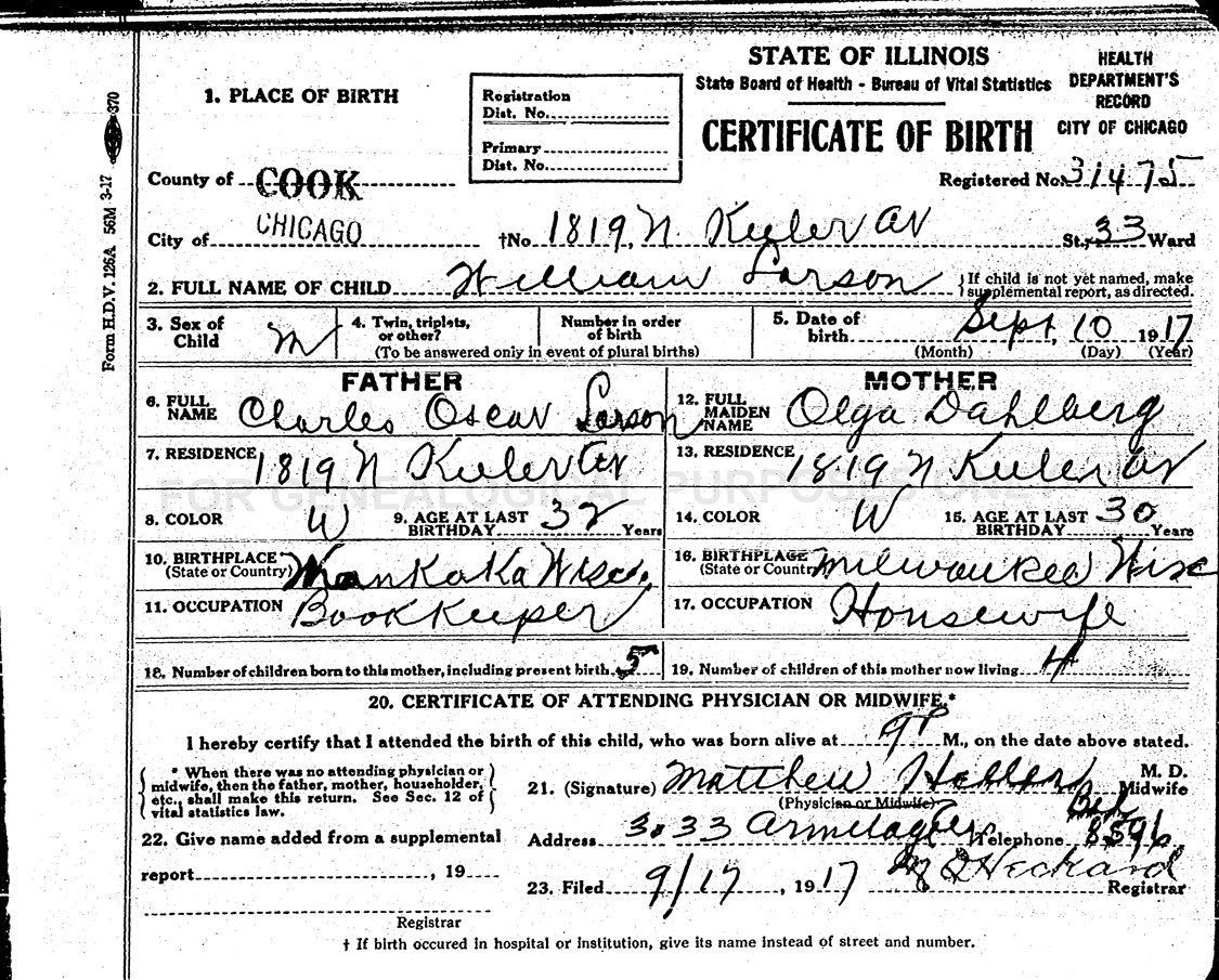 William Larson was b orn September 10, 1917, at 1819 N. Keeler Ave., Chicago, Cook Co., IL.