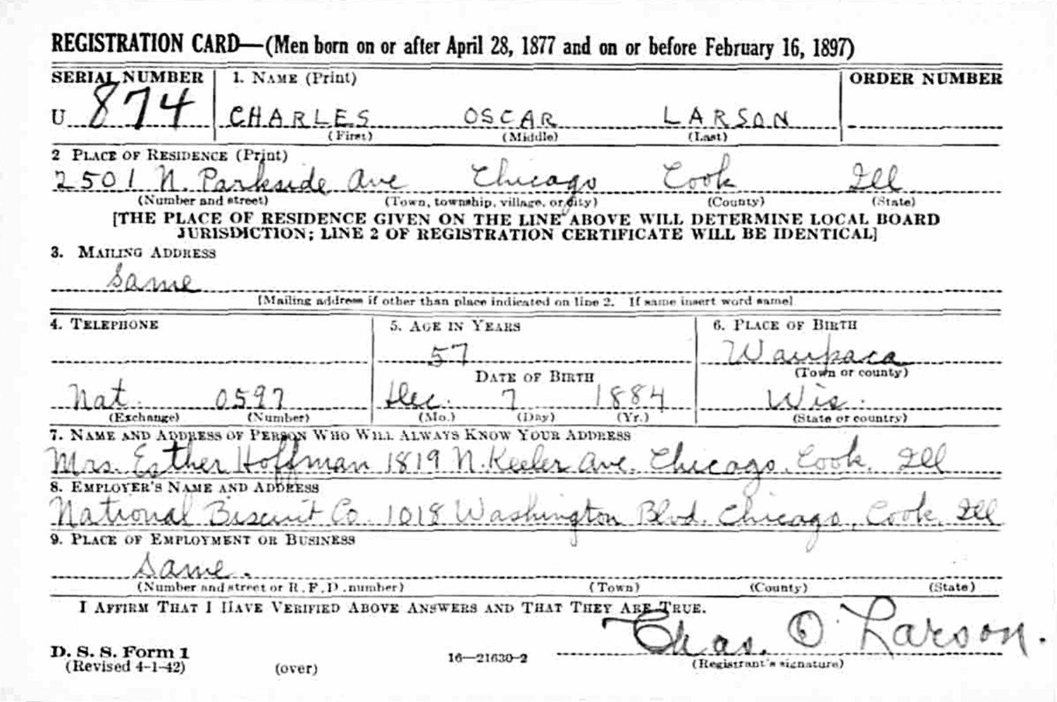 The WWII Draft Registration Report dated April 27, 1942, shows Charles Oscar Larson (age 57), born December 7, 1884, in Waupaca, WI, works for the National Biscuit Company, and is living at 2501 N. Parkside Avenue, Chicago, Cook Co., IL. The person who will always know his address is Mrs. Esther Hoffman, 1819 N. Keeler Ave., Chicago, Cook Co., IL.