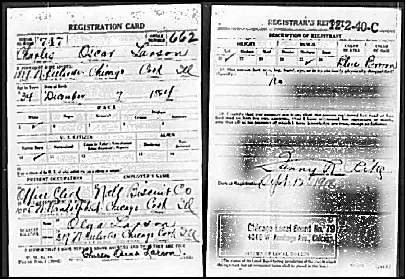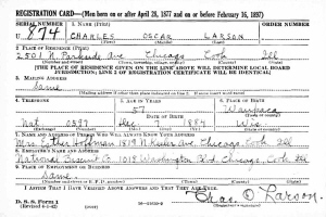 The WWI Draft Registration Report dated September 12, 1918, shows Charles Oscar Larson (age 34), born December 7, 1884, is a married Office Clerk and is living at 1819 N. Keeler Ave., Chicago, Cook Co., IL.