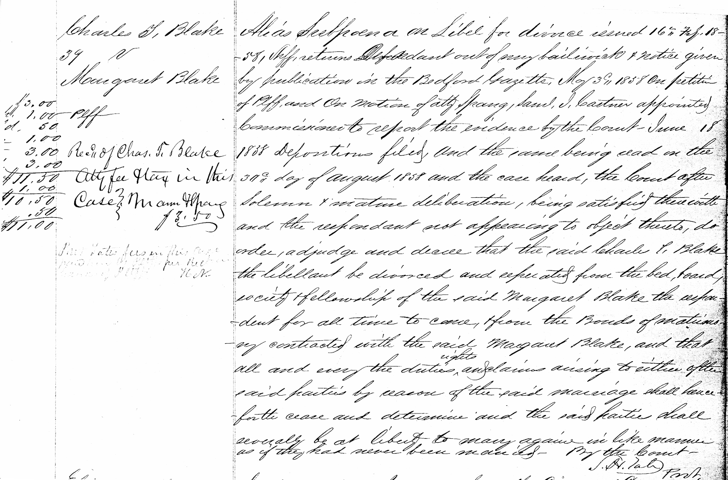 Alias Subpoena on Libel for divorce issued 16th Feb. 18 - 58, Deff returns Defendant out of my bailiwick & notice given by publication in the Bedford Gazette, May 3, 1858 On petition of Pltf, and on motion of atty. Sprang, Saml. I. Castner appointed Commissioner to report the evidence by the court - June 18 1858 Depositions filed, and the same being read on the 30th day of August 1858 and the case heard, the Court after Solemn & mature deliberation, being satisfied therewith and the respondent not appearing to object thereto, do order, adjudge and decree that the said Charles T. Blake the libellant be divorced and separated from the bed, board, society and fellowship of the said Margaret Blake the respondent for all time to come, from the Bonds of matrimony contracted with the said Margaret Blake, and that all and every the duties, rights and claims arising to either after said parties by reason of the said marriage shall henceforth cease and deterrence and the said parties shall severally be at liberty to marry again in like manner as if they had never been married - By the Court H. Tate Pvst.