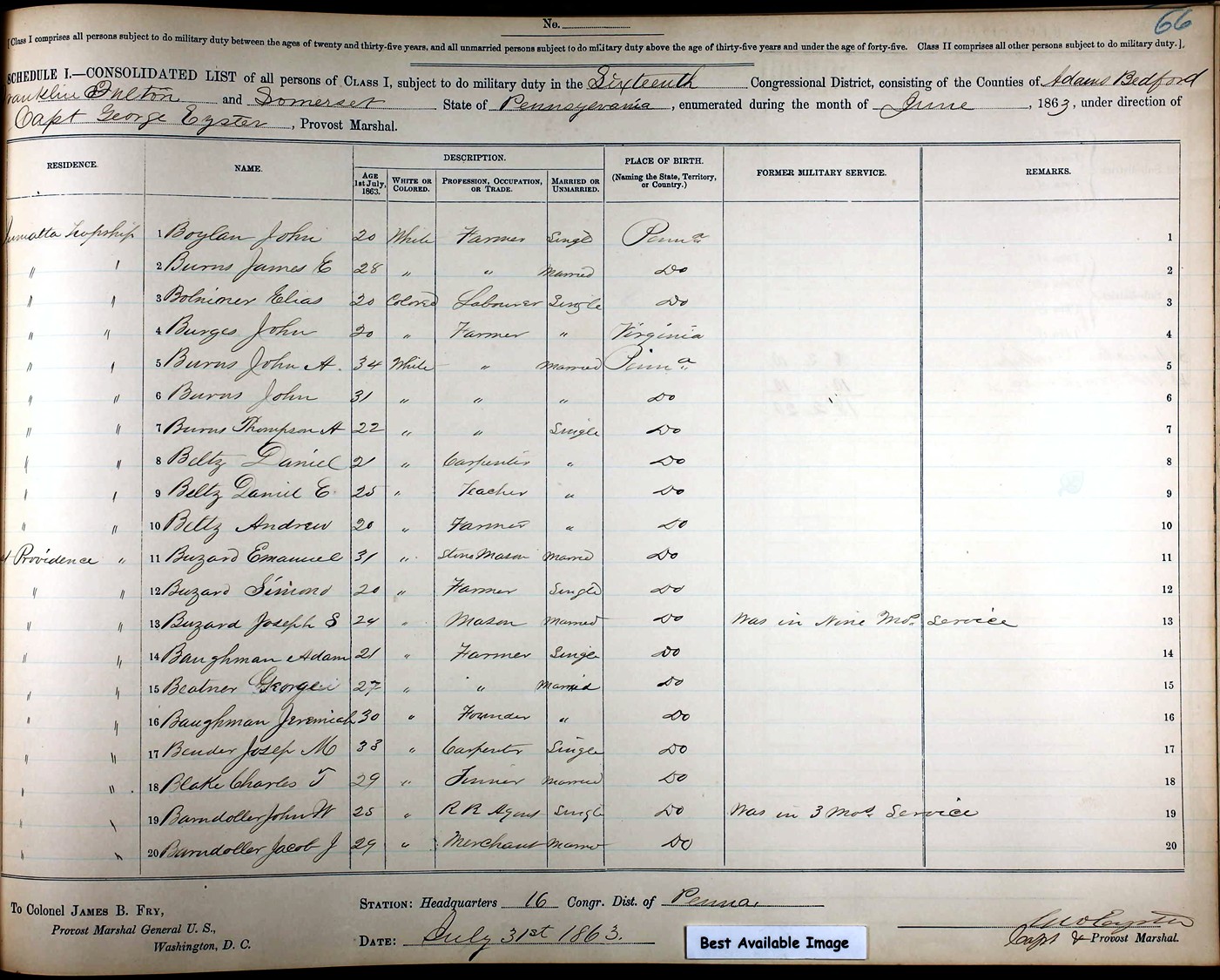 The 1850 U. S. Census taken on August 27, 1850, shows Burdine Blake (age 50) born in Pennsylvania is a farmer with real estate valued at $7,000 is living in Martinsburg Borough, Blair Co., PA. Living with him is his wife Mazee Blake (age 50) born in Pennsylvania. Also living there are their children: Wesley Blake (age 16) and Mazee Blake (age 17), both born in Pennsylvania.