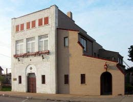 If you walk east along the south side of Lincolnway, past the Slininger Funeral Home, the next building you pass will be a concrete-covered on which stands unobtrusively between Slininger's and the Maid-Rite Cafe.