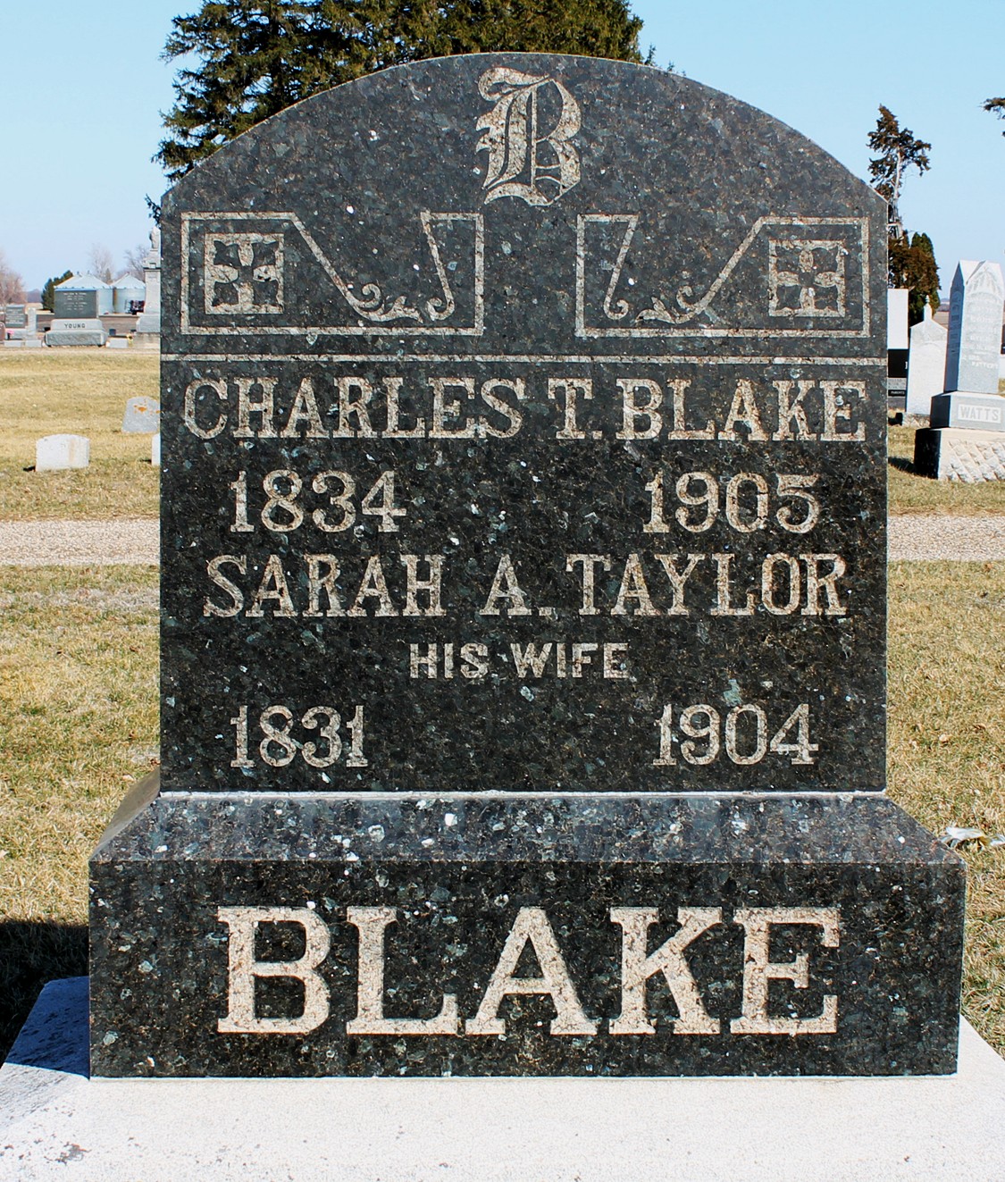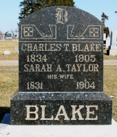 Charles Wesley Typper "Charley" Blake and Sarah Ann (Taylor) Blake are buried in Jefferson Cemetery, Jefferson, Grant Twp., Greene Co., IA. Thanks to Find-A-Grave for making this image available.