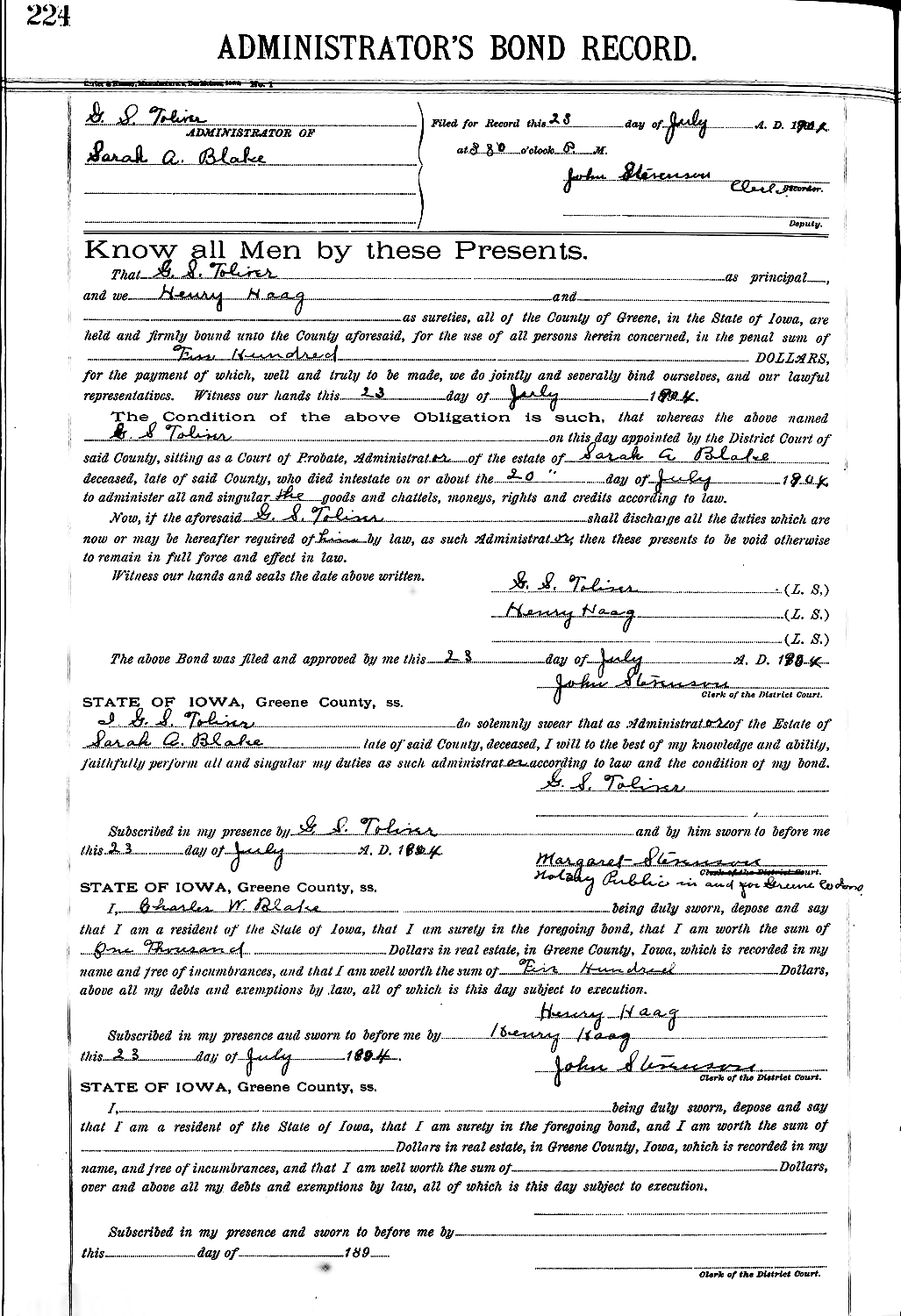 , Jefferson, Greene Co., IA, Wednesday, February 5, 1908The property belonging to the estate of the late Charles T. Blake and wife, was sold yesterday at referee's sale by Referee Henry Haag. The store building on the south side of the square, occupied by the Finch shoe shop on the first floor, was sold to Mr. G. S. Toliver for $1,200; the Blake Hotel building was sold to Mr. G. S. Toliver for $1,200; and the residence just west of the of the hotel, occupied by Mrs. A. V. Finch and family, was sold to Dr. C. W. Blake for $1,100. The sale was made in order to facilitate the settlement of the estate and the distribution of inheritances among the heirs.