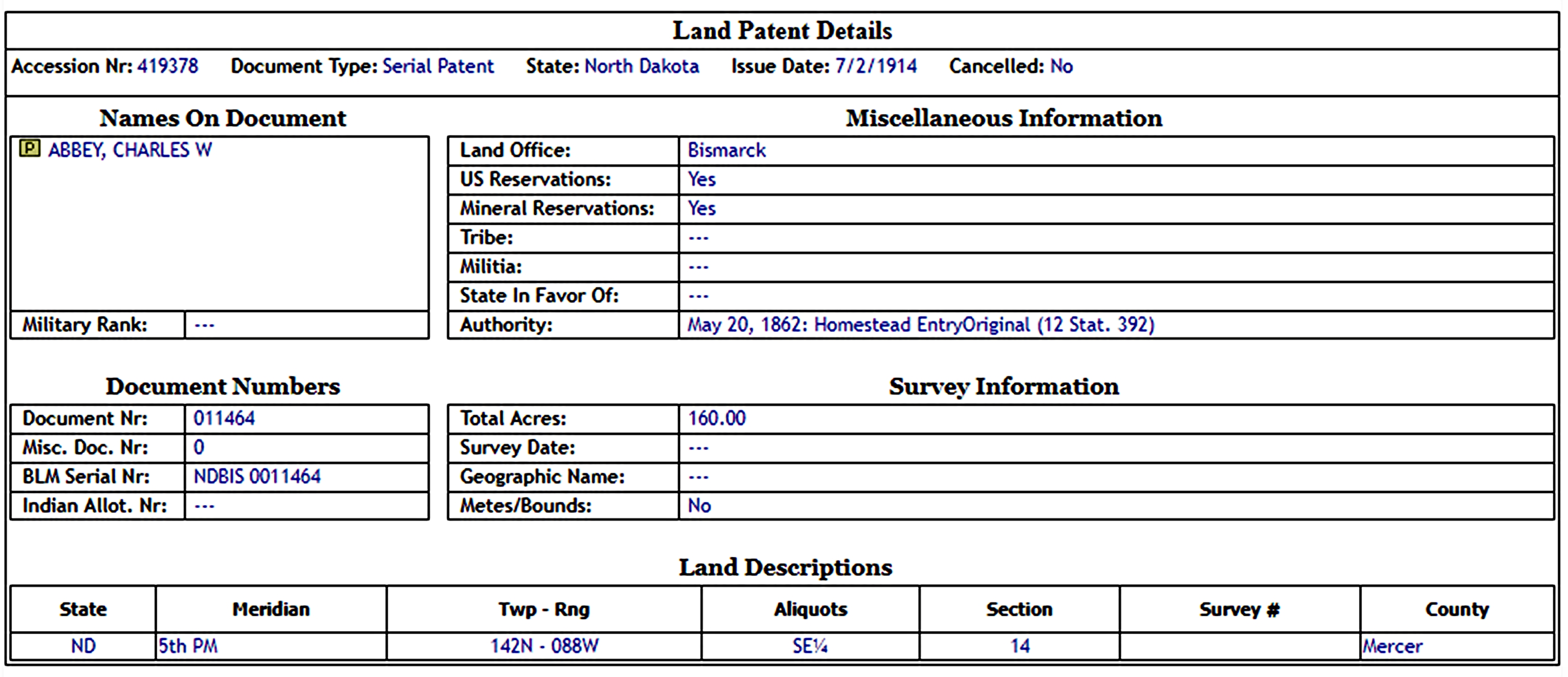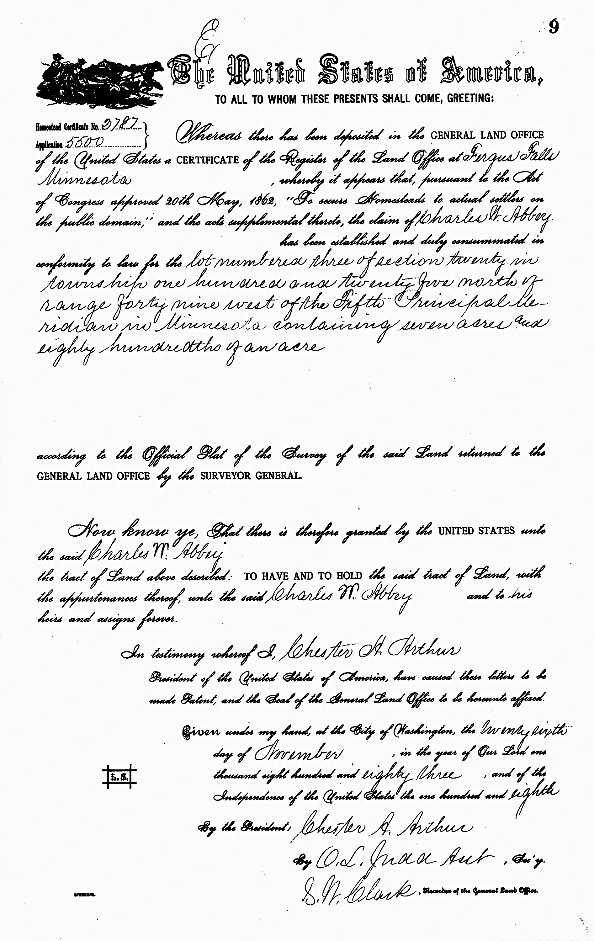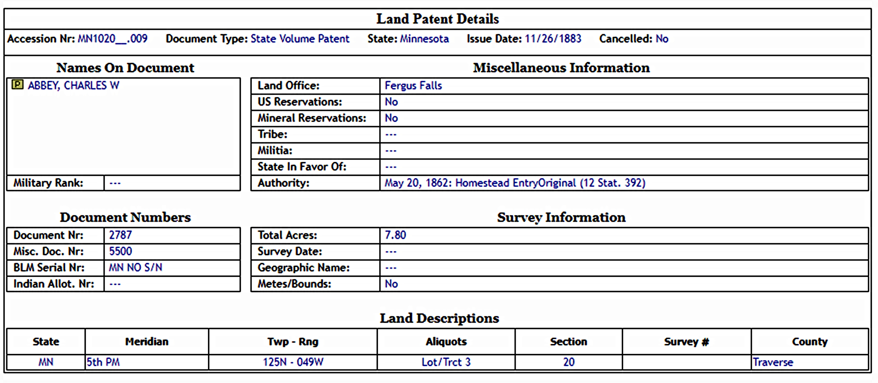 On November 26, 1883, Charles W. Abbey received a Land Patent for 7.80 acres of land in Lot/Tract 3 of Section 20, T 125N, R 049W, of the 5th PM, Traverse Co., MN.