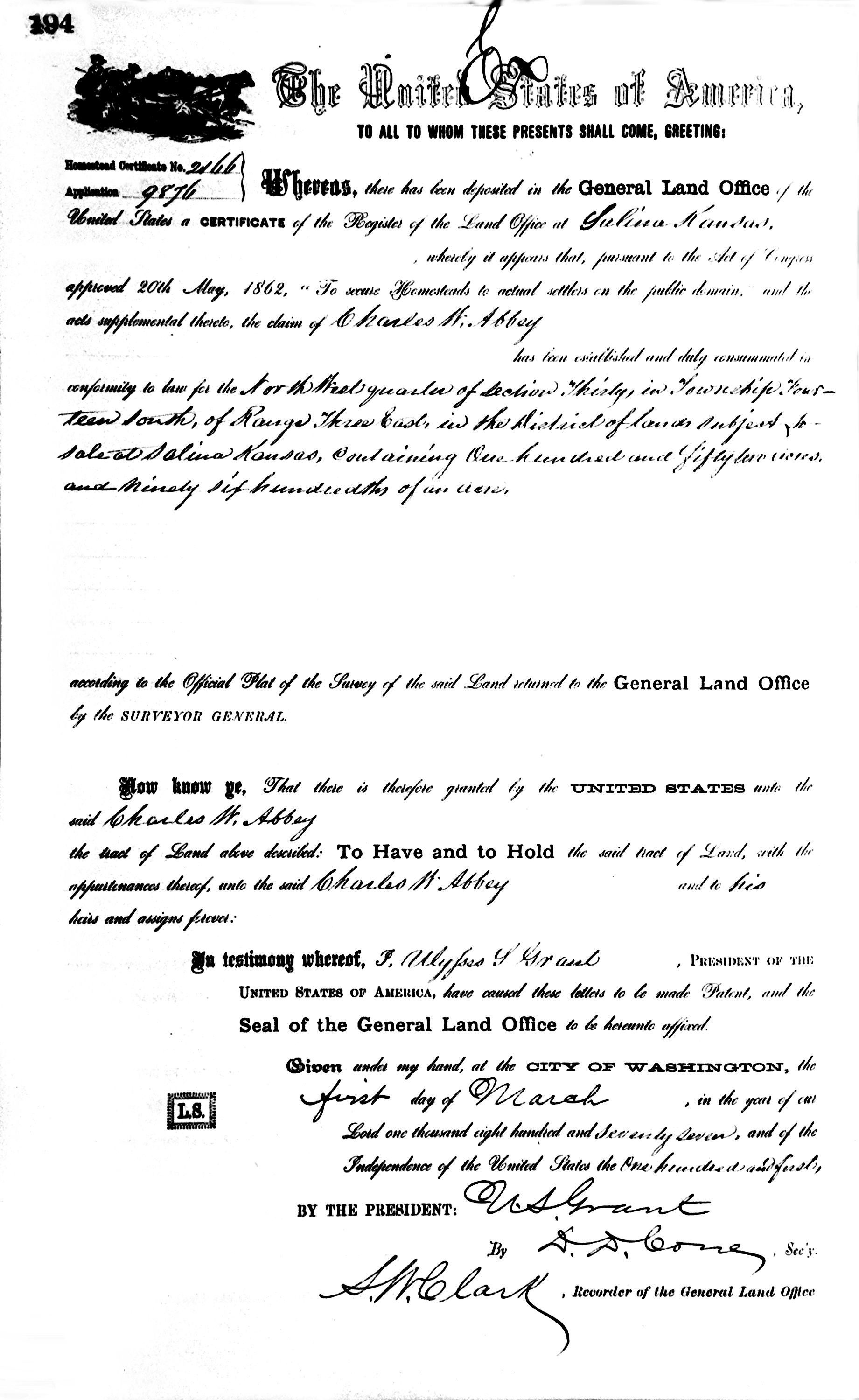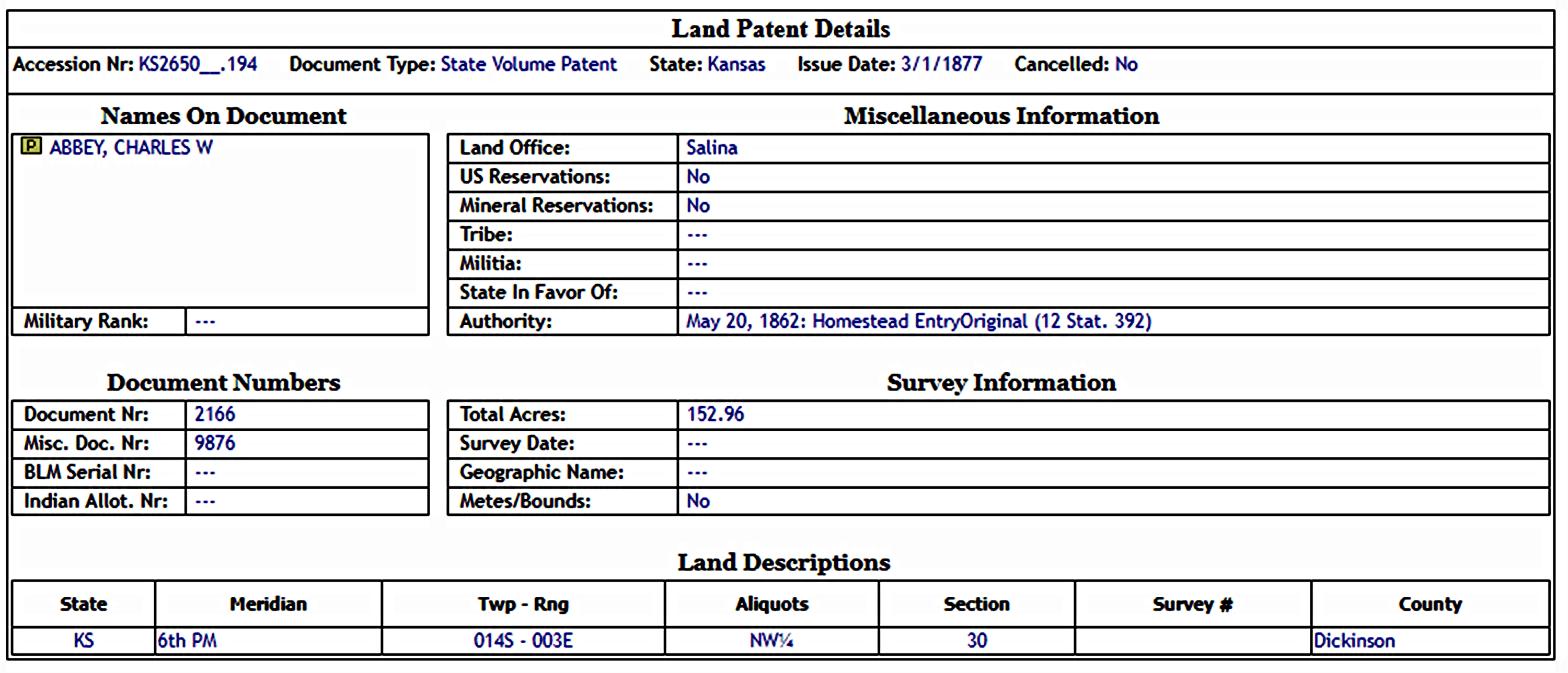 On March 1, 1877, Charles W. Abbey received a Land Patent for 152.96 acres of land in the NW 1/4 of Section 30, T 014S, R 003E, of the 6th PM, Dickinson Co., KS.