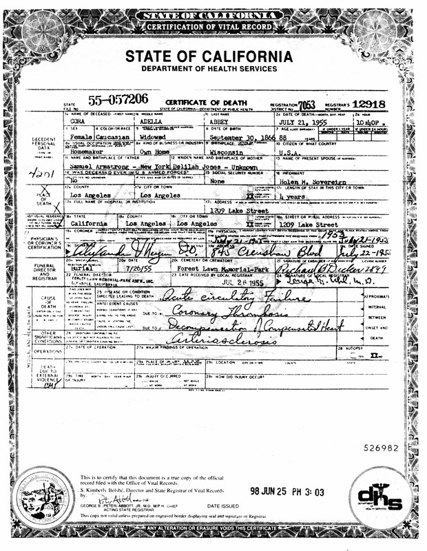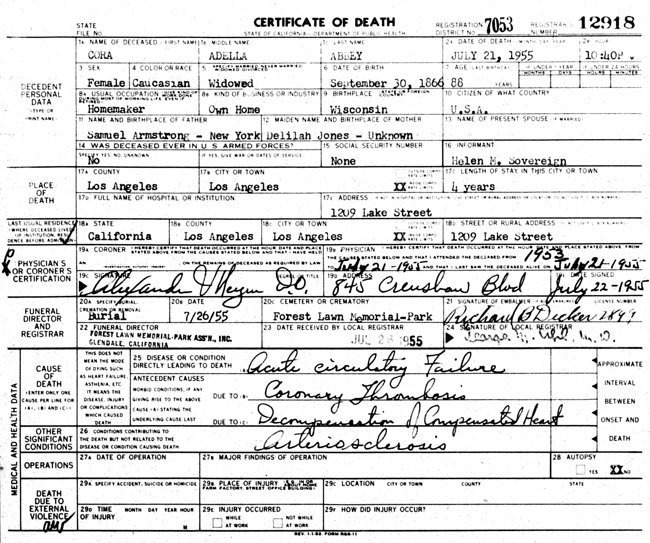 Cora Adella Armstrong was born September 30, 1866, in a log house on the Baraboo River in the Town of Baraboo, Sauk Co., WI, and died July 21, 1955, at 1209 Lake Street, Los Angeles, Los Angeles Co., CA, at age 88. Buried in Forest Lawn Memorial Park (Hollywood Hills), Los Angeles, Los Angeles Co., CA. She is the daughter of Samuel Bolton Armstrong of Edwardsburgh, Canada West (Ontario), and Delilah Matilda Jones of New York.