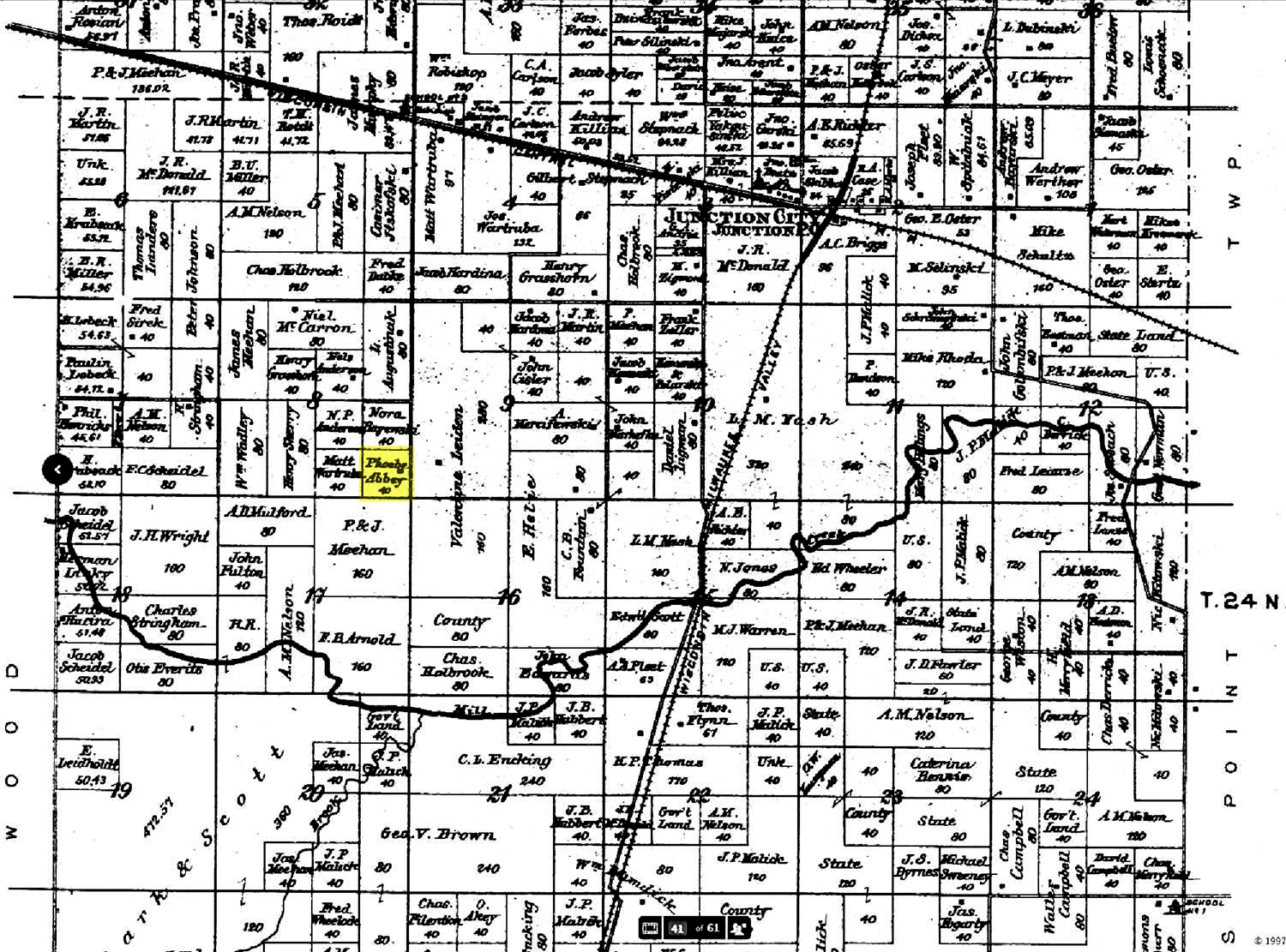 The 1895 Plat Map for Carson Twp., Portage Co., WI, shows Phoebe Abbey is the owner of 40 acres in the SE 1/4 Qtr. of the SE Qtr. of Section 8. Living nearby are Jacob Scheidel, F. C. Scheidel, and some Krubsack families.