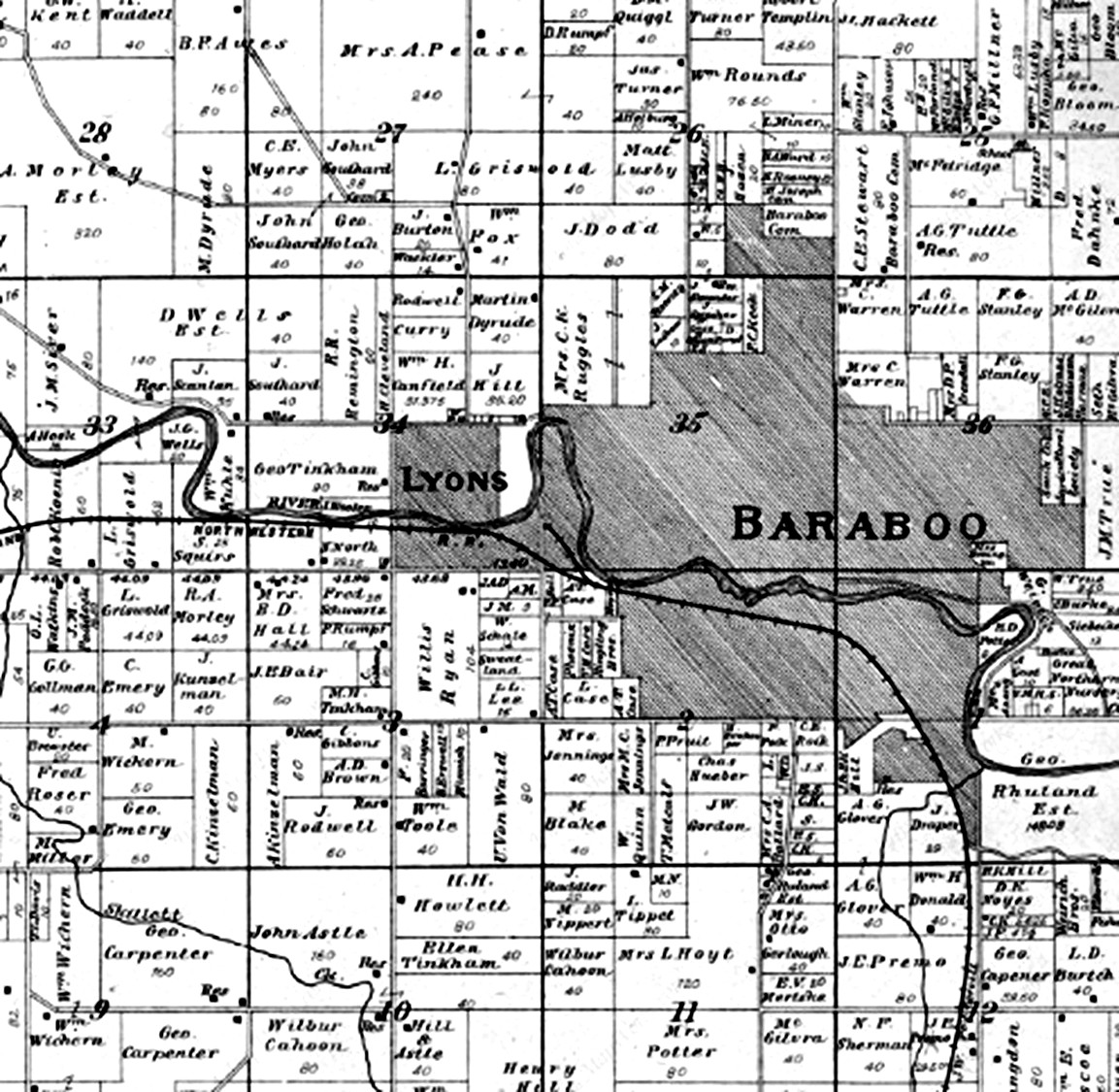 The 1906 Plat Map showing the adjacent communities of Lyons and Baraboo, Sauk Co., WI, 1906. Years later, Lyons would be renamed West Baraboo.