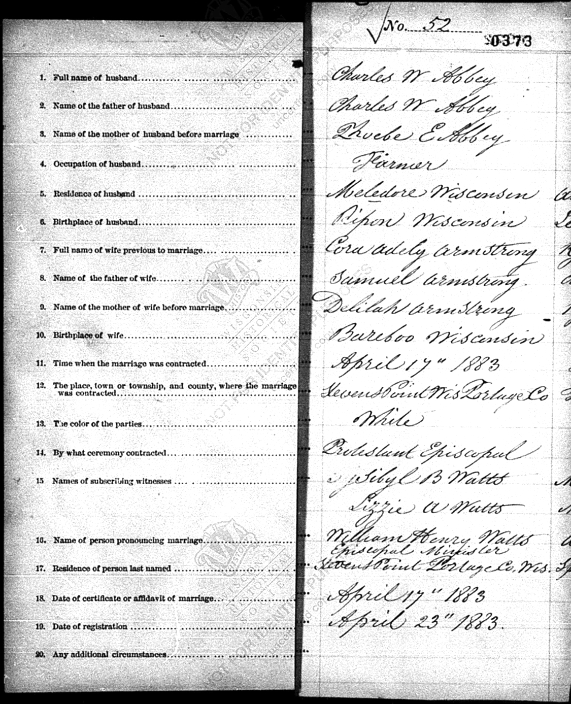 Charles Washington "Charlie" Abbey (age 21), a bachelor, and Cora Adella Armstrong (age 22), a maiden, were married April 17, 1883, at the rectory of the Church of the Intercession, Stevens Point, Portage Co., WI.