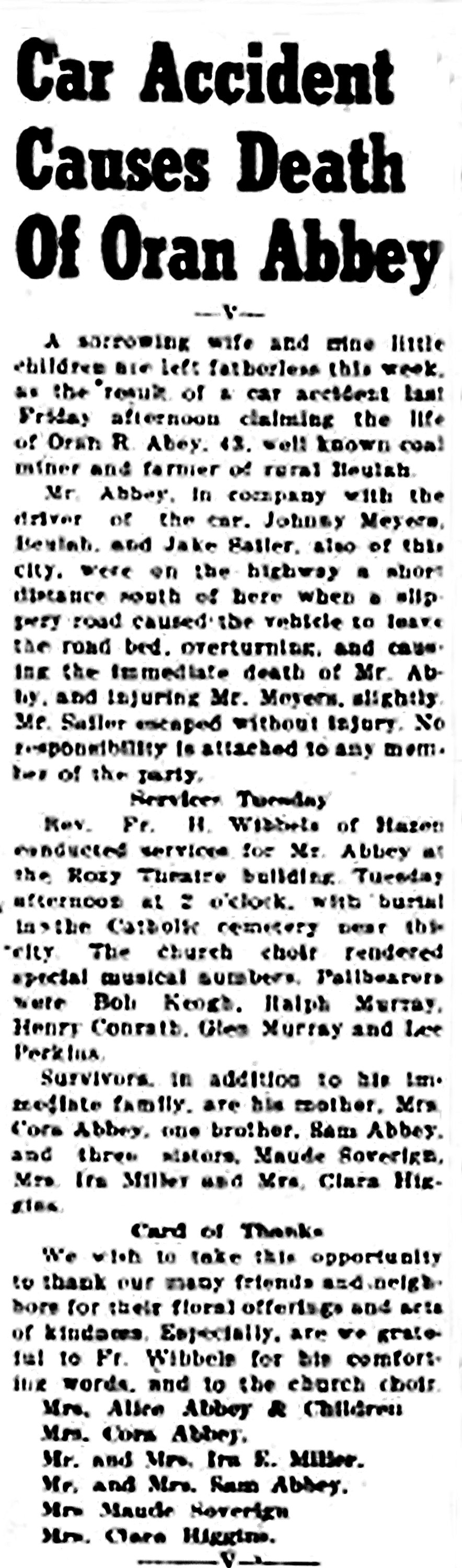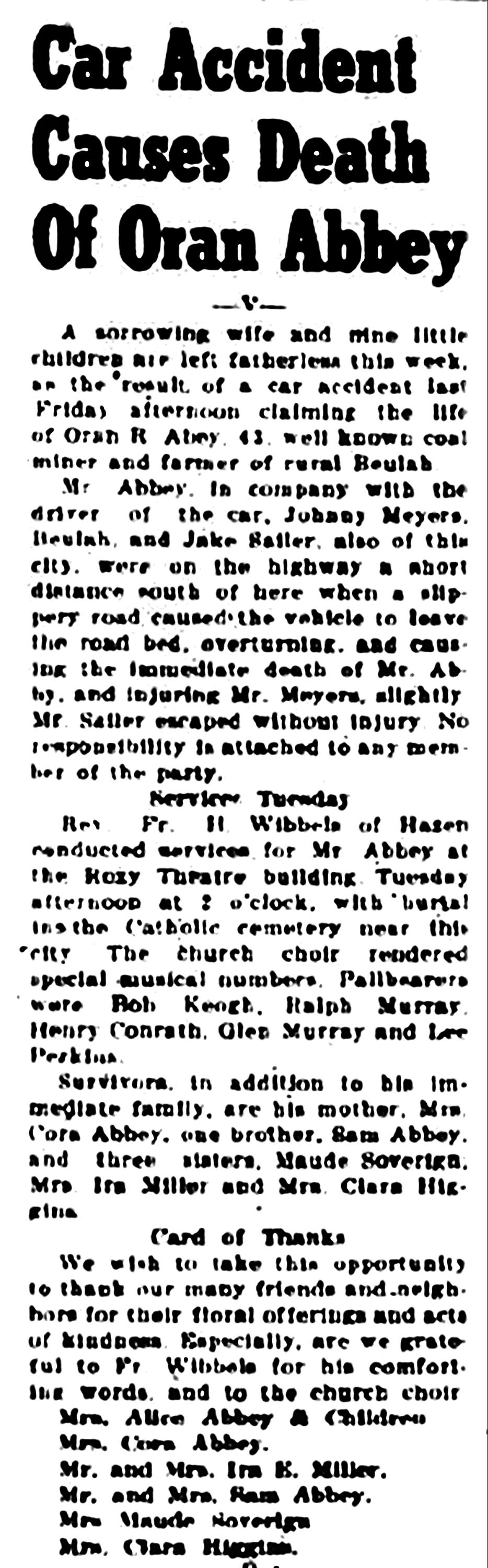 - Oran Ralph Abbey: Born October 13, 1899, in the Town of Milladore, Wood Co., WI; Died November 12, 1943, in Beulah, Mercer Co., ND (age 44). Buried in Saint Joseph's Catholic Cemetery, Mercer Co., ND. Married September 25, 1926, in Bismarck, Burleigh Co., ND, to Alice Frances Herman: Born July 5, 1901, in Glen Ullin, Morton Co., ND; Died March 27, 1982, in Beulah, Mercer Co., ND (age 80). Buried in Saint Joseph's Catholic Cemetery, Mercer Co., ND.