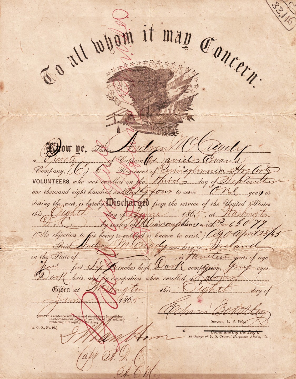 Andrew McCready was discharged from Company C, Pennsylvania Heavy Artillery, on June 8, 1865, at Washington, DC.
