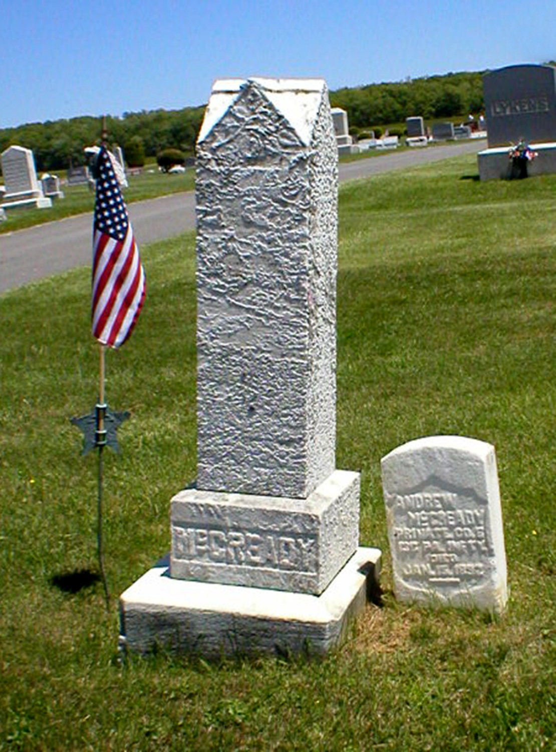 Andrew McCready died January 15, 1897, in Martinsburg, Blair Co., PA, at age 52. Buried in Fairview Cemetery, Martinsburg, Blair Co., PA.