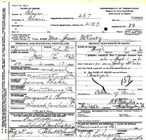 - George Hahn McCready: Born April 10, 1893, in Banksville, Allegheny Co., PA; Died June 21, 1945, at the Mather Coal Mine, Morgan, Greene Co., PA (age 62). Married about 1907 in Unknown, to Jane Devina "Jennie" Bell: Born February 1, 1882, in Langloan, Lanarkshire, Scotland; Died October 25, 1951, at Masonic Hospital, Elizabethtown, Lancaster Co., PA (age 69).