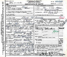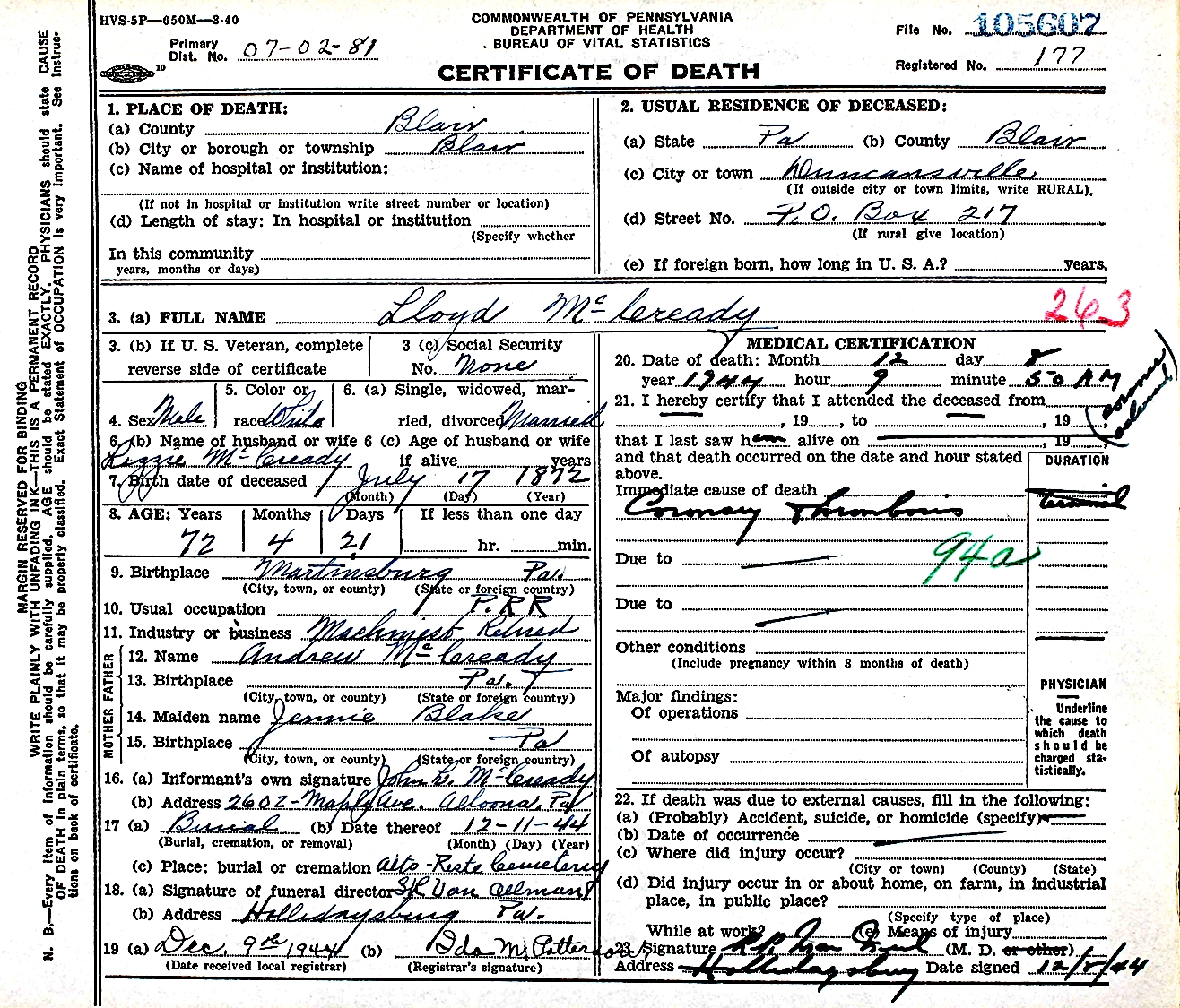 Lloyd M. McCready died December 8, 1944, in Blair Co., PA, at age 72. Buried in Alto-Reste Burial Park, Altoona, Blair Co., PA.