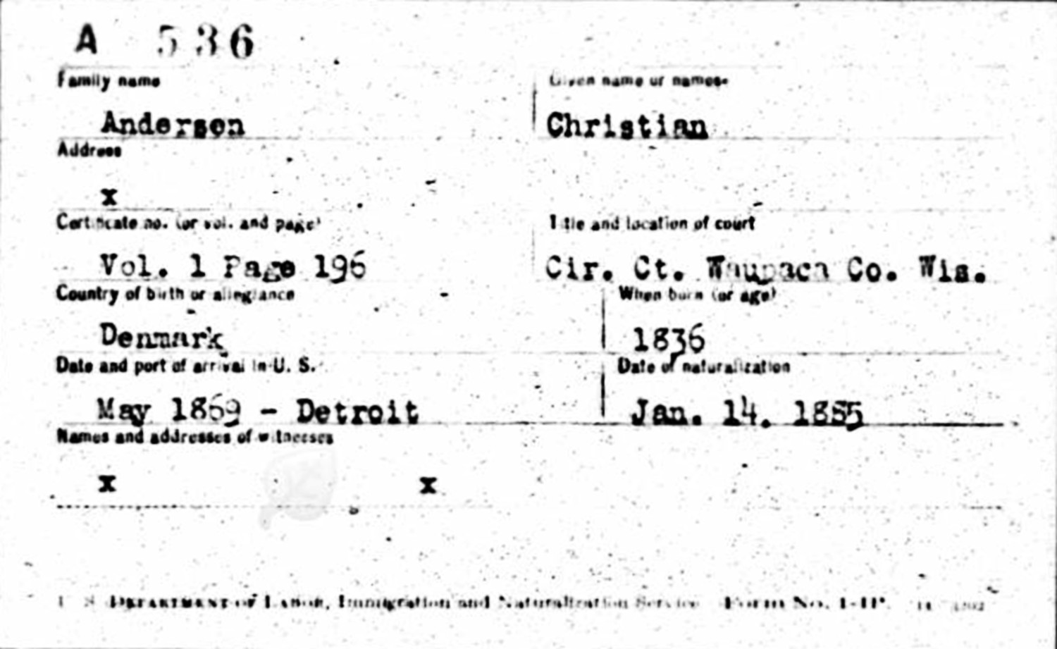 On January 14, 1885, Christian Andersen became a Naturalized U. S. Citizen.