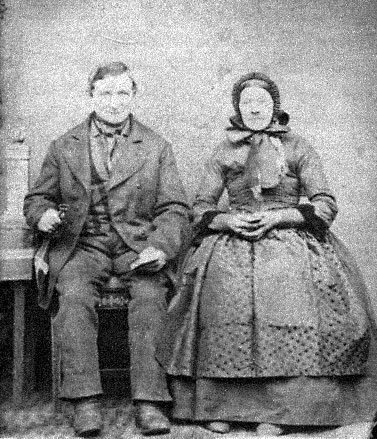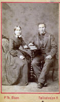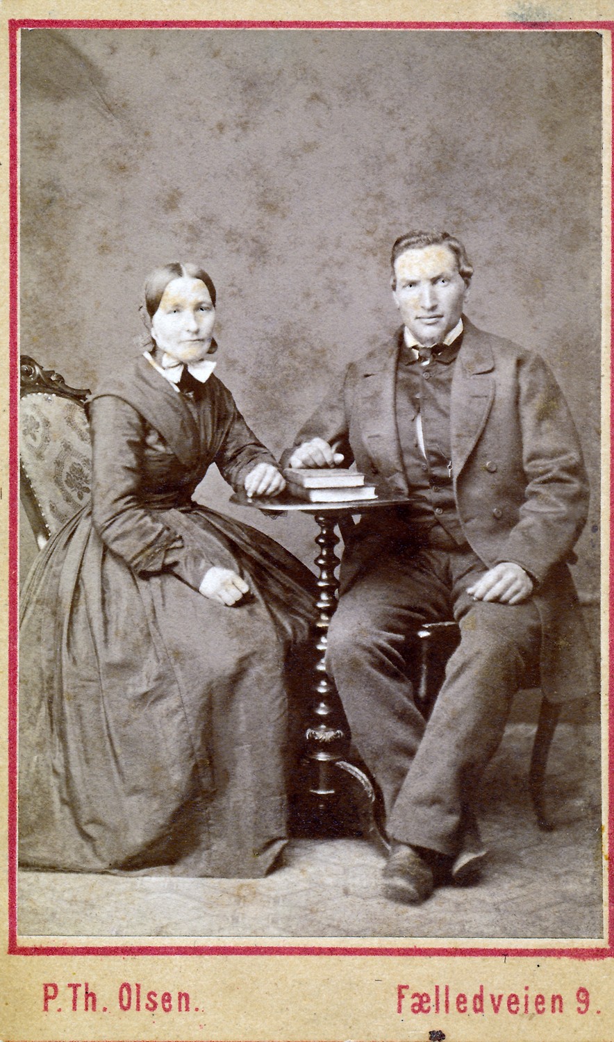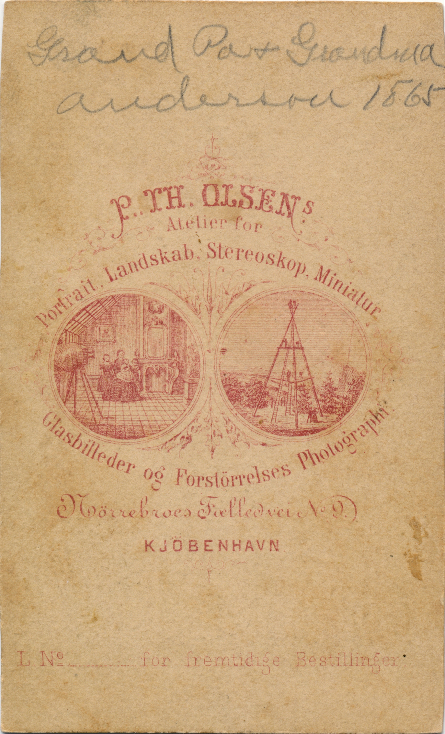 Christian Andersen and Johanne (Nielsen) Andersen, Copenhagen, Denmark, 1865. A remarkable example from the early days of photography. This "picture card" was in the photo album collection of Edythe "Eda" (Lewis) Lear, the daughter of Juliane Marie "Julia" (Andersen) Lewis. Please note that the eyes of both people were hand retouched with blue ink, an interesting way to add color in those days.