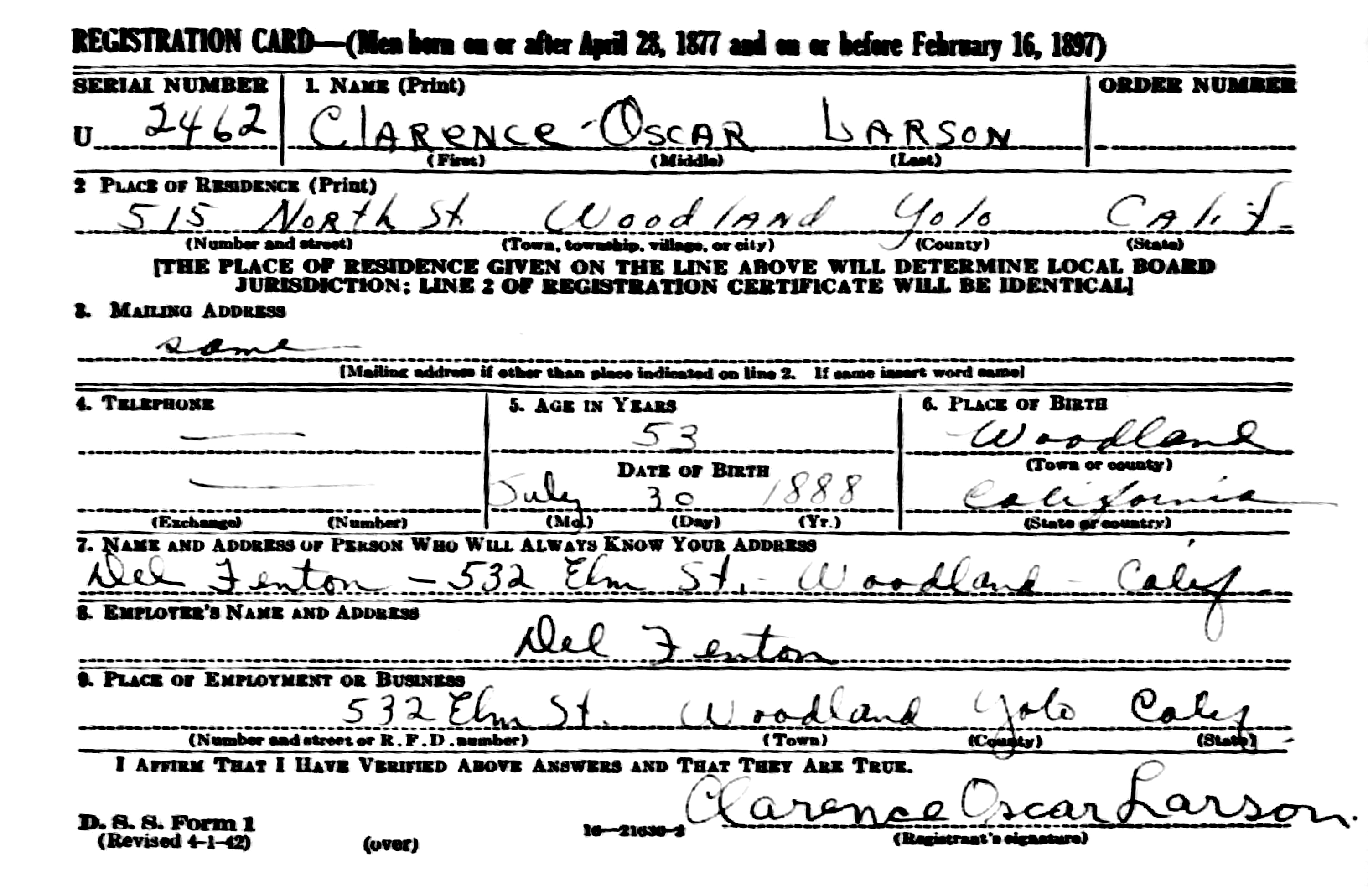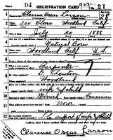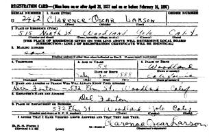 The WWII Draft Registration Report dated May 26, 1942, shows Clarence Oscar Larson (age 53), born July 30, 1888, in Woodland, CA, is living at 515 North Street, Woodland, CA. He is employed by Del Fenton, Woodland, CA. He is 5' 10 1/2" tall; 145 Pounds in Weight; Blue Eyes and Brown Hair. He has a scar on the index finger of his right hand.