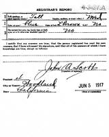 The WWI Draft Registration Report dated June 5, 1917, shows Clarence Oscar Larson (age 28), born July 30, 1888, in Woodland, CA, is living at 204 Clover, Woodland, CA. He is employed as a Carpenter for D. Fruton, Woodland, CA. He is married with a wife and child. He is of tall height, medium build, blue eyes and light brown hair.