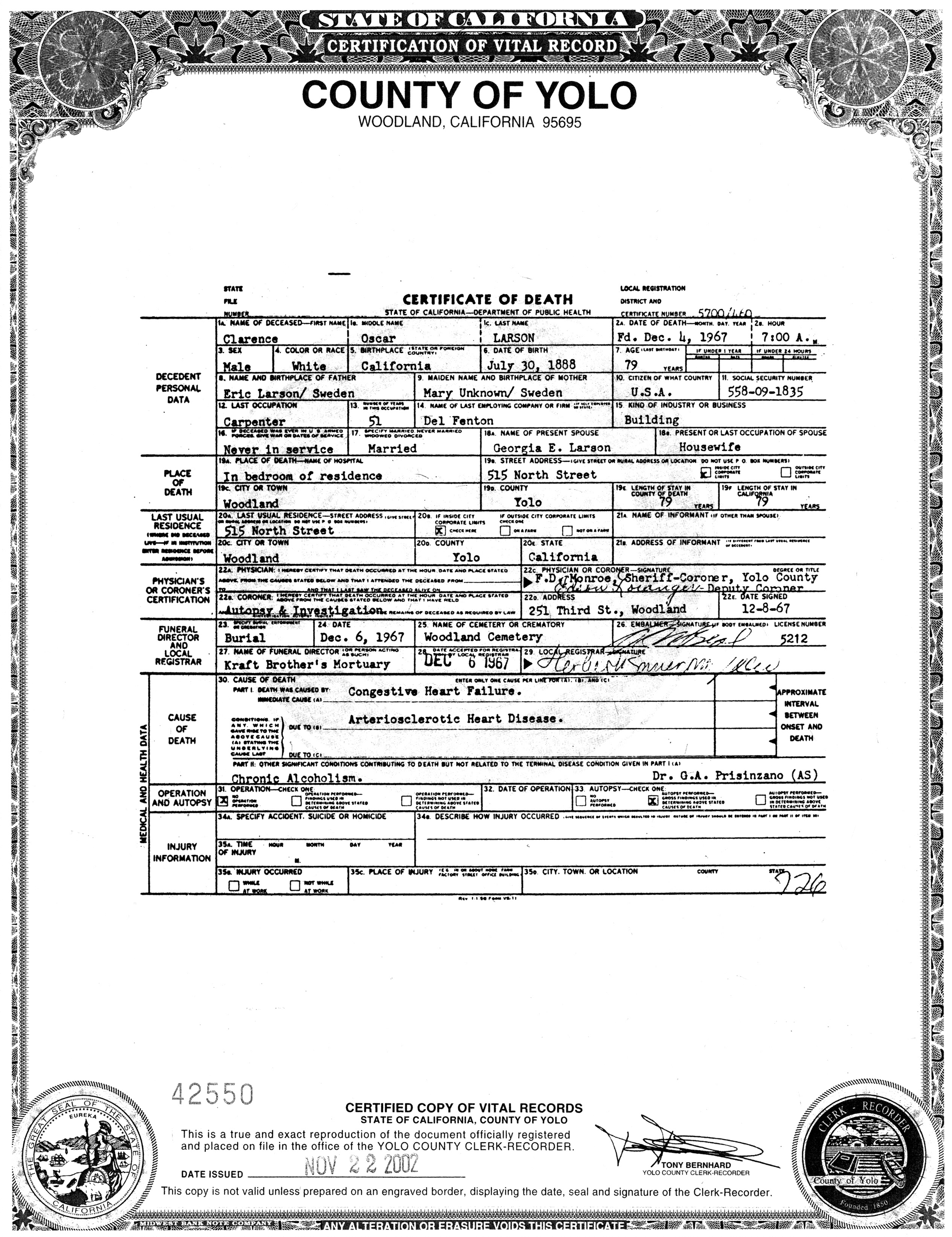 Clarence Oscar Larsson died December 4, 1967, in the City of Woodland, Yolo Co., CA, at age 79. Buried in Plot Block 22, Lot 35, Grave 4, in Woodland Cemetery, Woodland, Yolo Co., CA.