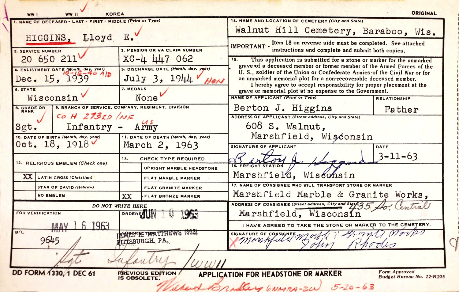 Higgins, Lloyd E., b. Oct/Nov 18, 1918, d. Mar 2, 1963, Wis. Sgt., Inf, WWII,