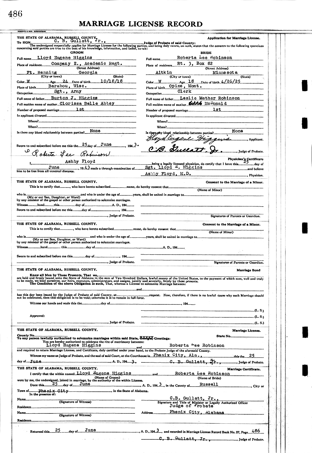 Lloyd Eugene Higgins and Roberta Lee Robinson were married June 25, 1943, in Phenix City, Russell Co., AL.