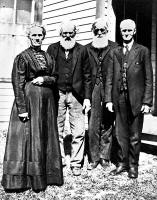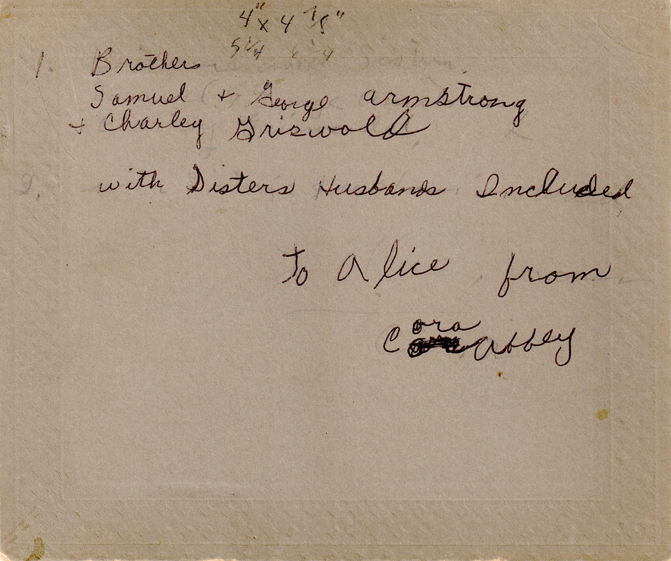 Four Armstrong relatives, left to right: Clarissa H. "Clara" (Armstrong) Griswold, Samuel Bolton "Sam" Armstrong, George Wood Armstrong, and Samuel Luther "Charley" Griswold . Taken before 1917. Photo courtesy of Kay Koslan, who found this photo among the effects of her great-grandmother, Cora Adella (Armstrong) (Abbey) Thompson .