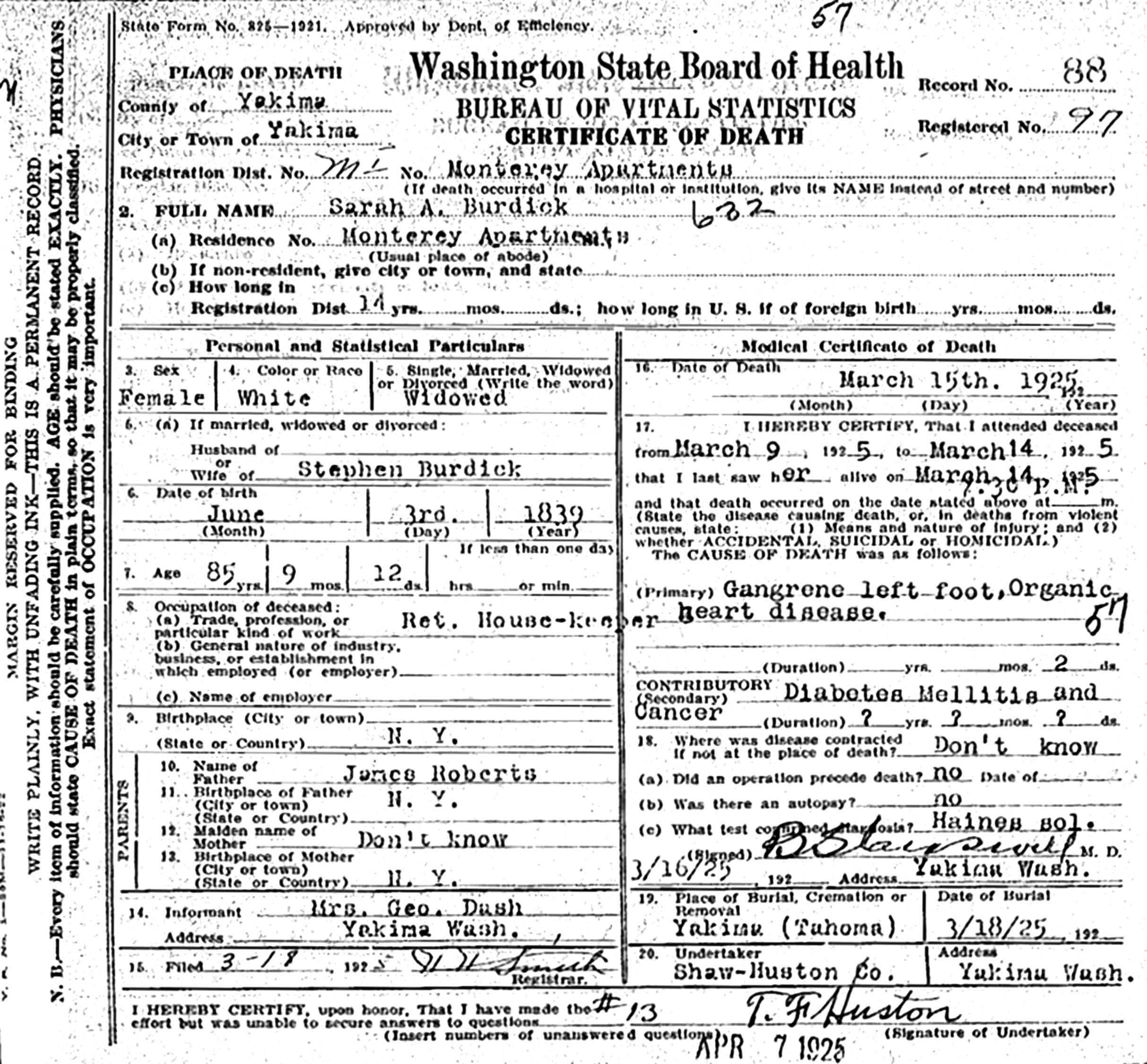 Leigh Larson note: Stephen McIntyre Burdick was born in 1820, and died November 16, 1906, at the home of his son, Charles, in Baraboo, at age 86. Sarah Amanda (Roberts) Burdick was born April 21, 1840, in New York, and died March 15, 1925, at Monterey Apartments, Yakima, Yakima Co., WA, at age 84. Buried in Tahoma Cemetery, Yakima, Yakima Co., WA. Married November 18, 1864, in Columbia Co., WI. Her parents are James Monroe Roberts Jr. of Pendleton, Anderson Co., SC, and Sarah Mason of Laurens Co., SC. In 1860, Amanda Roberts was unmarried, and living in the Stephen M. Burdick household in Kingston, Sauk Co., WI. Elizabeth Ann "Betsy" (Caldwell) Burdick died December 29, 1863, in Baraboo, Sauk Co., WI, at about age 85.