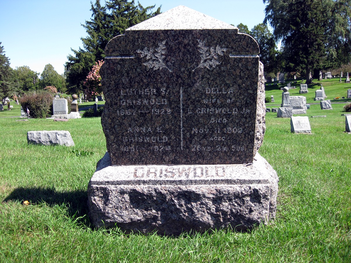 - Luther Stephen Griswold: Born June, 1867, in the Town of Baraboo, Sauk Co., WI; Died December 8, 1929, in Baraboo, Sauk Co., WI (age 62) . Buried in Walnut Hill Cemetery, Baraboo, Sauk Co., WI. Married (1) November 24, 1886, in Sauk City, Sauk Co., WI, to Olive Mae Reymour: Born February 21, 1865, in the Town of Constantia, Oswego Co., NY; Died January 28, 1949, at 1468 South Float Avenue, Freeport, Stephenson Co., IL (age 83). Buried in Freeport City Cemetery, Freeport, Stephenson Co., IL. D ivorced about 1892 in Wisconsin . Married (2) about 1894 in Wisconsin, to Amy Unknown: Born Unknown; Died Unknown. Married (3) to Della Weigel: Born September 6, 1876, in Ohio; Died November 11, 1902, at 625 Grand Avenue, Chicago, Cook Co., IL (age 26 years, 2 months, 5 Days). Buried in Walnut Hill Cemetery, Baraboo, Sauk Co., WI. Married (4) July 27, 1915, at the Evangelical Church, Sauk Co., WI, to Anna Emma "Annie" (Mahler) Doro: Born about January, 1882, in Bukowitz, WestPreußen, Polen (Poland) ; Died August 31, 1924, in the Town of Greenfield, Sauk Co., WI (age 42). Buried in Walnut Hill Cemetery, Baraboo, Sauk Co., WI.