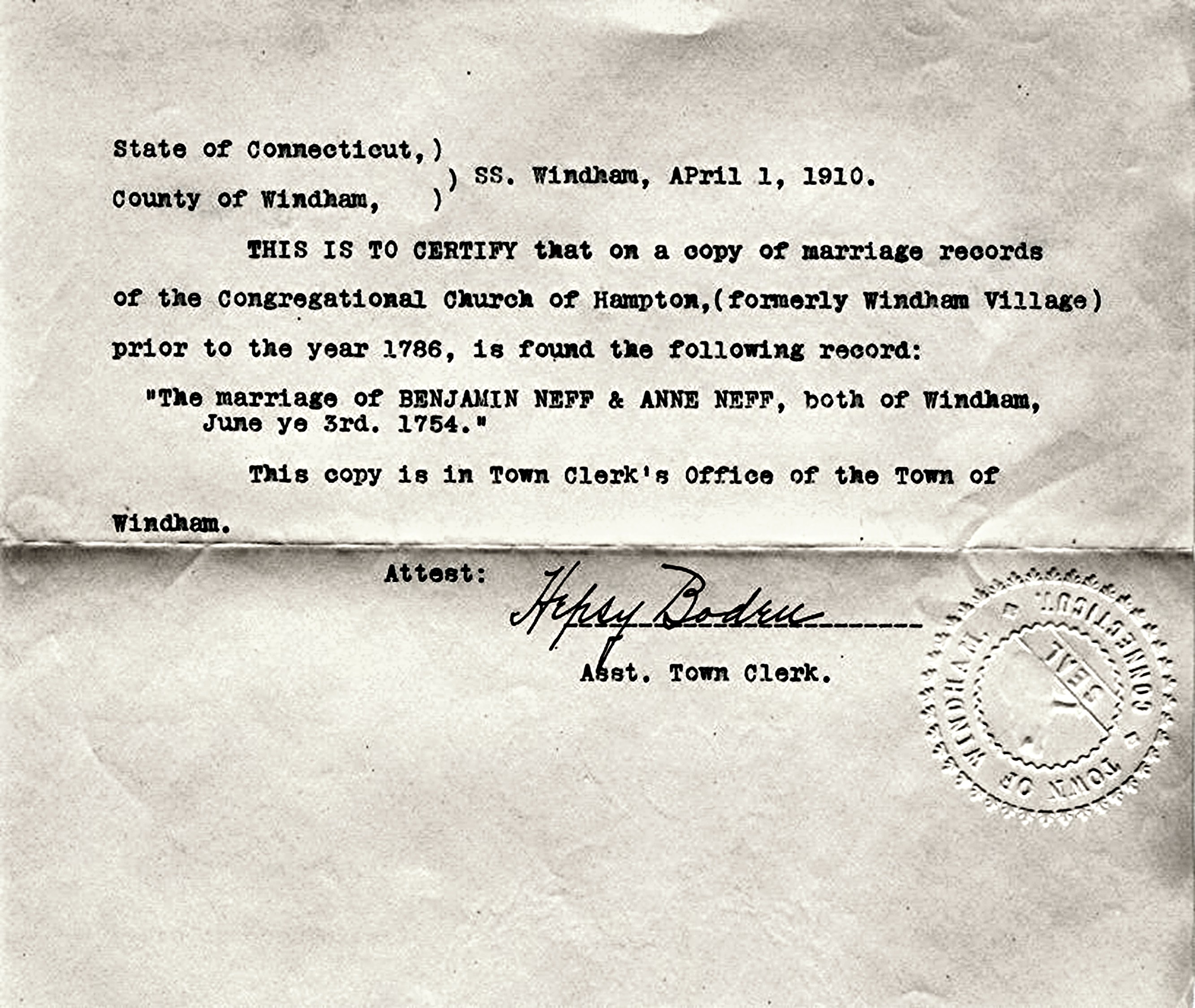 These were both sisters of Ann Neff. I am also enclosing a certified copy of a record from the certified copy made by the clerk of the Hampton Church, of the marriages of Hampton Church records. This copy belongs to the town clerk of Windham. You will remember that I have a printed reference for this marriage, taken from Bailey�s "Early Connecticut Marriages." but this record omitted the part important to us, namely that they were "both of Windam." (Hampton was set off from Windam, in 1786). Now there was only one ANN NEFF I Windham, at the date of this marriage, nor for many years after.