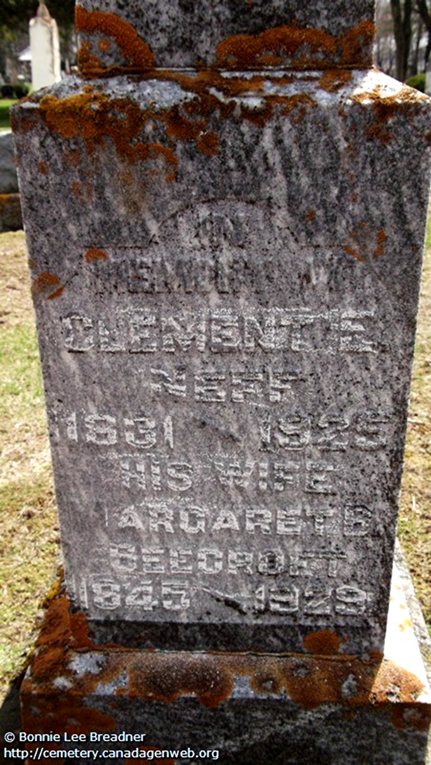 - Clement Edmund Neff: Born February 18, 1832, in Haldimand Twp., Northumberland Co., Upper Canada; Died February 14, 1925, in Medicine Hat, Alberta, Canada (age 92). Buried in Trinity United Church Cemetery, Nottawasaga Twp., Simcoe Co., Ontario, Canada. Married to Margaret Bislin Beecroft: Born December 4, 1844, in Nottawasaga Twp., Simcoe Co., Canada West; Died March 16, 1929, in Medicine Hat, Alberta, Canada (age 84). Buried in Hillside Cemetery, Medicine Hat, Alberta, Canada.
